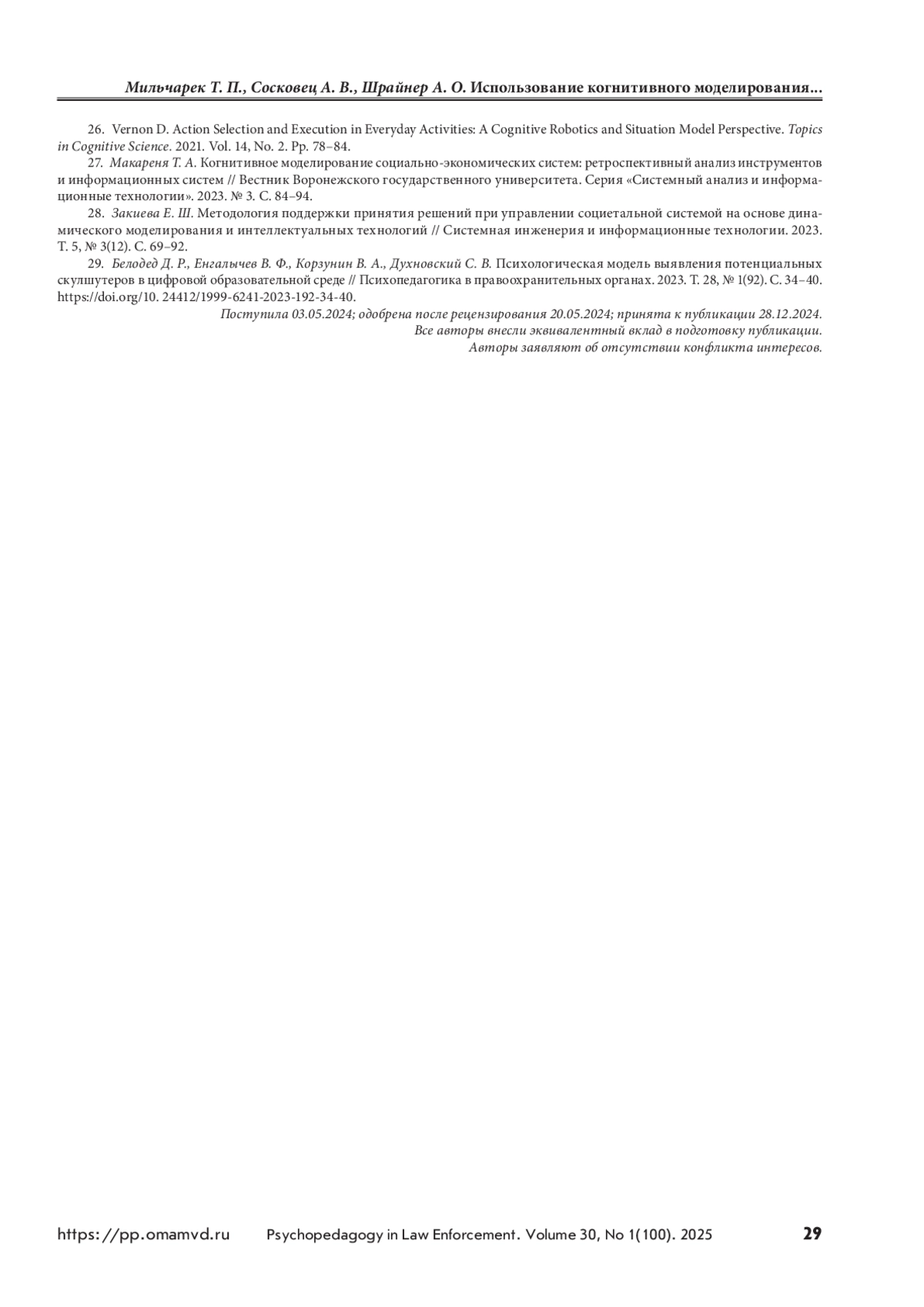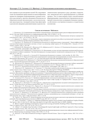 29. Белодед Д. Р., Енгалычев В. Ф., Корзунин В. А., Духновский С. В. Психологическая модель выявления потенциальных скулшутеров в цифровой образовательной среде // Психопедагогика в правоохранительных органах. 2023. Т. 28, № 1(92). С. 34–40. https://doi.оrg/10. 24412/1999-6241-2023-192-34-40.