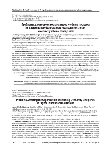 Цель — проведение системного анализа для выявления и ранжирования проблем, возникающих при организации и реализации учебного процесса по дисциплинам в сфере основ безопасности жизнедеятельности в высших учебных заведениях. Материалы, результаты и обсуждение. Раскрыта важность решения научно-педагогических задач, нацеленных на повышение безопасности общества, уменьшение рисков появления чрезвычайных ситуаций техногенного характера и формирование ответственного отношения людей к собственной безопасности и безопасности окружающих. Определены и систематизированы факторы и условия, которые следует учитывать при решении основной научной проблемы при разработке научно-методологического аппарата и обоснования концепции развития преподавания основ безопасности жизнедеятельности в высших учебных заведениях, включающие вопросы военной подготовки. Выводы. На основе анализа направлений разрешения научно-педагогической проблемы, влияющих на учебный процесс по дисциплинам безопасности жизнедеятельности, выявлено противоречие в практике рассматриваемой предметной области и предложена научная гипотеза его разрешения. Представлены перспективные направления для разработки концепции педагогического мастерства и эффективного развития педагогики в сфере безопасности жизнедеятельности на современном этапе.