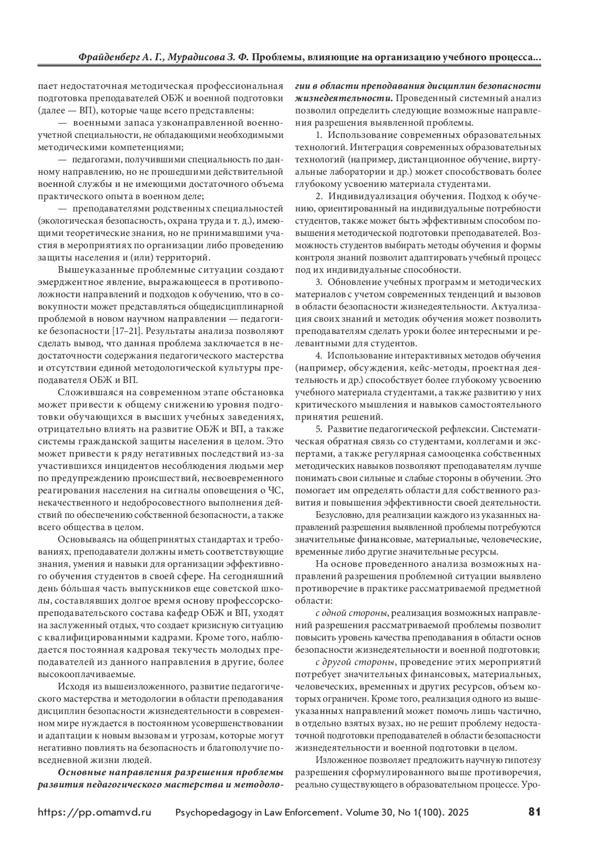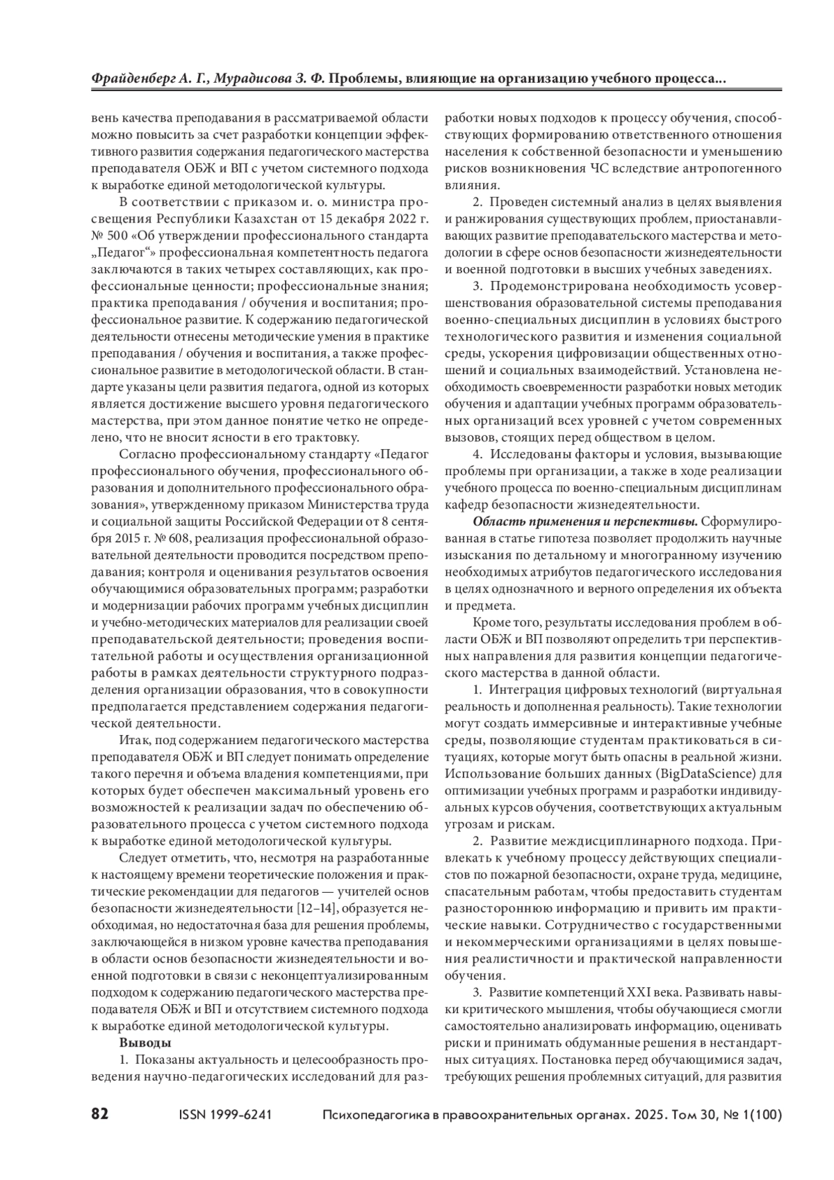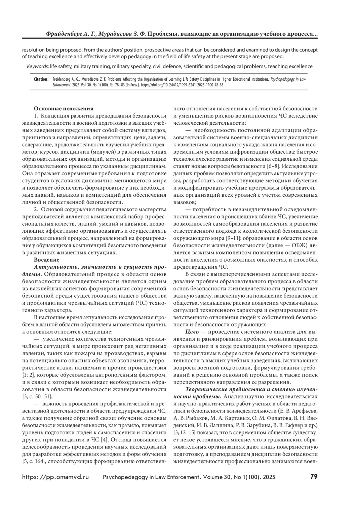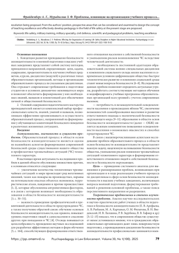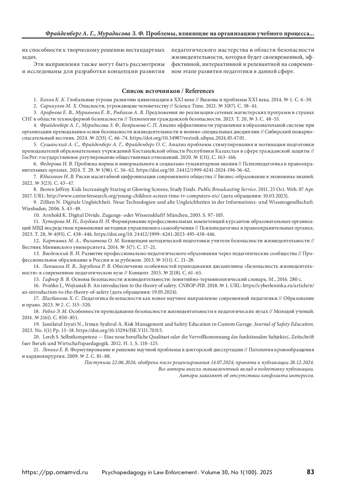 4. Фрайденберг А. Г., Мурадисова З. Ф., Бояринова С. П. Анализ эффективности управления в образовательной системе при организации преподавания основ безопасности жизнедеятельности и военно-специальных дисциплин // Сибирский пожарно-спасательный вестник. 2024. № 2(33). С. 66–74. https://doi.org/10.34987/vestnik.sibpsa.2024.85.47.01.