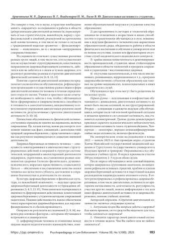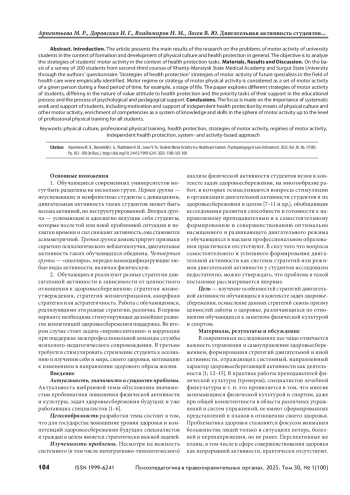 1. Обучающиеся современных университетов могут быть разделены на несколько групп. Первая группа — неуспевающие и конфликтные студенты с девиациями, двигательная активность таких студентов может быть весьма активной, но неструктурированной. Вторая группа — успевающие и адекватно ведущие себя студенты, которые после той или иной проблемной ситуации и нехватки времени и сил снижают активность, она становится асимметричной. Третья группа демонстрирует признаки скрытого психологического неблагополучия, двигательная активность таких обучающихся обеднена. Четвертая группа — «школяры», нередко коммодифицирующие любые виды активности, включая физическую.