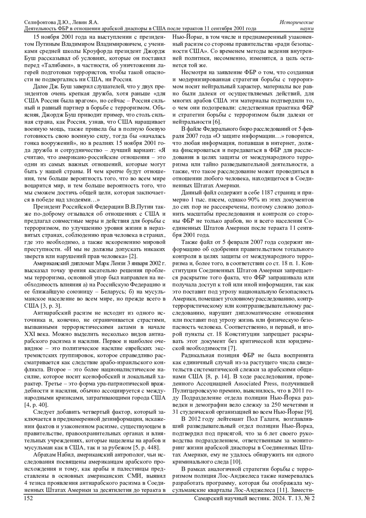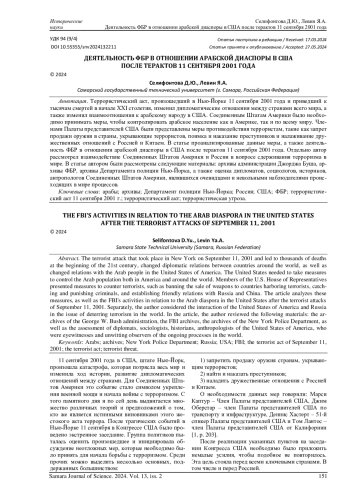 Террористический акт, произошедший в Нью-Йорке 11 сентября 2001 года и приведший к тысячам смертей в начале XXI столетия, изменил дипломатические отношения между странами всего мира, а также изменил взаимоотношения к арабскому народу в США. Соединенным Штатам Америки было необходимо принимать меры, чтобы контролировать арабское население как в Америке, так и по всему миру. Членами Палаты представителей США были представлены меры противодействия террористам, такие как запрет продажи оружия в страны, укрывающие террористов, поимка и наказание преступников и налаживание дружественных отношений с Россией и Китаем. В статье проанализированные данные меры, а также деятельность ФБР в отношении арабской диаспоры в США после терактов 11 сентября 2001 года. Отдельно автор рассмотрел взаимодействие Соединенных Штатов Америки и России в вопросе сдерживания терроризма в мире. В статье автором были рассмотрены следующие материалы: архивы администрации Джорджа Буша, архивы ФБР, архивы Департамента полиции Нью-Йорка, а также оценка дипломатов, социологов, историков, антропологов Соединенных Штатов Америки, являвшихся очевидцами и невольными наблюдателями происходящих в мире процессов.