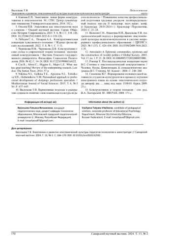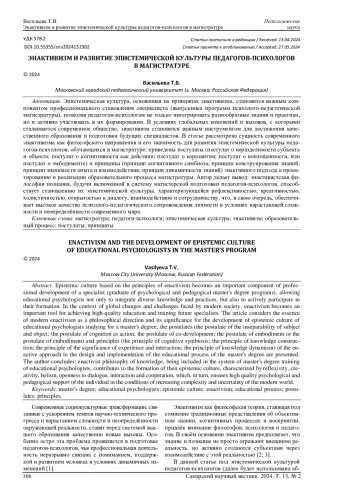 1. 	Васильева Т.В., Банников В.А. О необходимости формирования в системе непрерывного профессионального образования эпистемической культуры у педагогов-психологов в условиях информатизации современного российского общества // Педагогический научный журнал. 2023. Т. 6, № 6. С. 23-28. EDN: LTJKHC