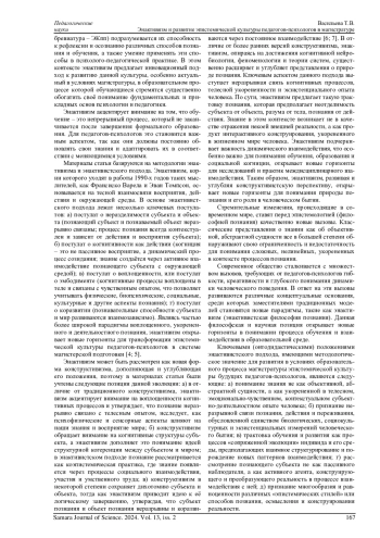 11. 	Вольхин С.Н., Никитина Н.И., Васильева Т.В. Антропологический подход к формированию эпистемической культуры педагогов-психологов в системе непрерывного профессионального образования // ЦИТИСЭ. 2023. № 3 (37). С. 424-434. DOI: 10.15350/2409-7616.2023.3.35 EDN: ZKZVMU