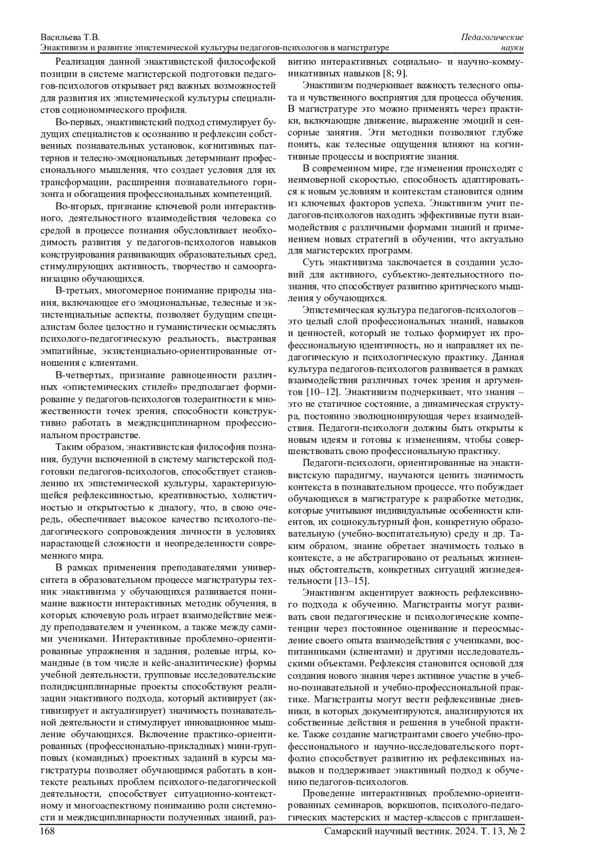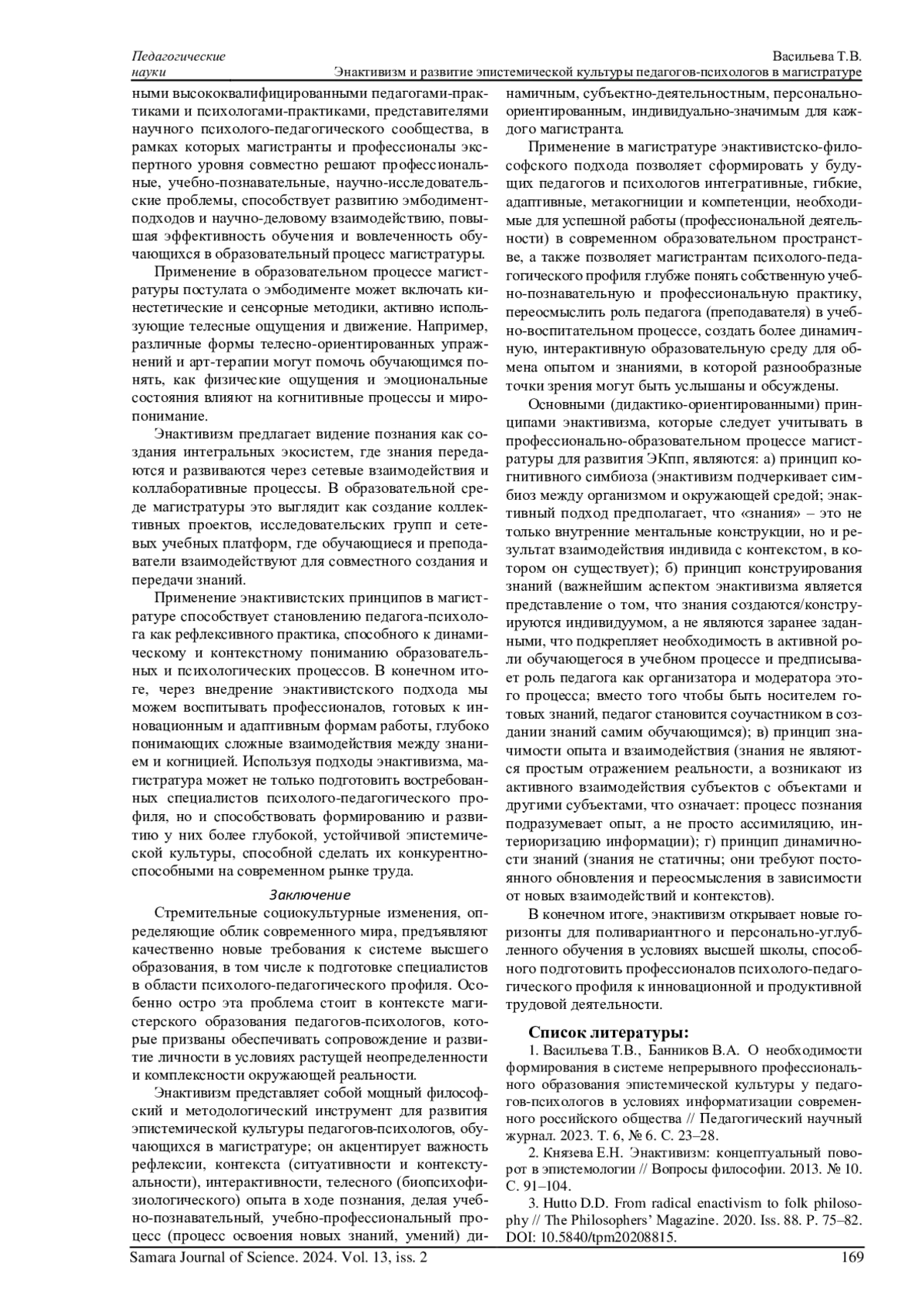 Эпистемическая культура, основанная на принципах энактивизма, становится важным компонентом профессионального становления специалиста (выпускника программ психолого-педагогической магистратуры), позволяя педагогам-психологам не только интегрировать разнообразные знания и практики, но и активно участвовать в их формировании. В условиях глобальных изменений и вызовов, с которыми сталкивается современное общество, энактивизм становится важным инструментом для достижения качественного образования и подготовки будущих специалистов. В статье рассмотрена сущность современного энактивизма как философского направления и его значимость для развития эпистемической культуры педагогов-психологов, обучающихся в магистратуре; приведены постулаты (постулат о неразделимости субъекта и объекта; постулат о когнитивности как действии; постулат о коразвитии; постулат о воплощенности, или постулат о эмбодименте) и принципы (принцип когнитивного симбиоза; принцип конструирования знаний; принцип значимости опыта и взаимодействия; принцип динамичности знаний) энактивного подхода к проектированию и реализации образовательного процесса магистратуры. Автор делает вывод: энактивистская философия познания, будучи включенной в систему магистерской подготовки педагогов-психологов, способствует становлению их эпистемической культуры, характеризующейся рефлексивностью, креативностью, холистичностью, открытостью к диалогу, взаимодействию и сотрудничеству, что, в свою очередь, обеспечивает высокое качество психолого-педагогического сопровождения личности в условиях нарастающей сложности и неопределённости современного мира.