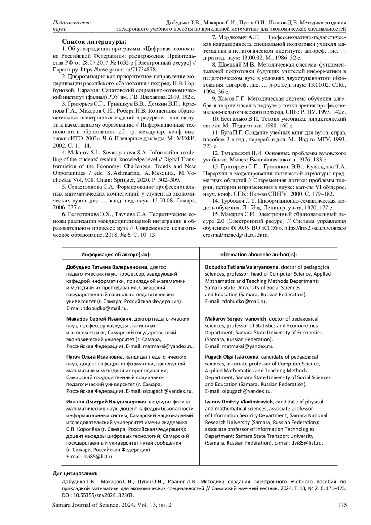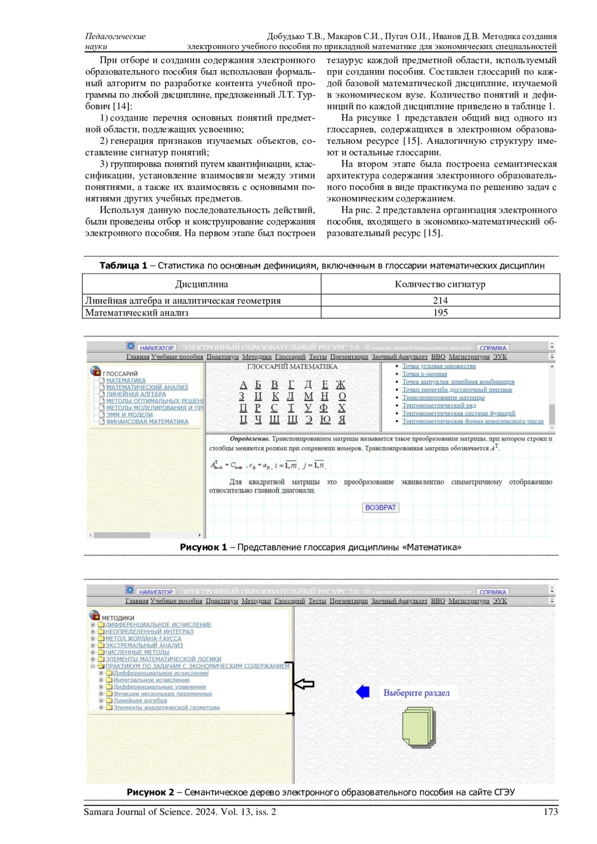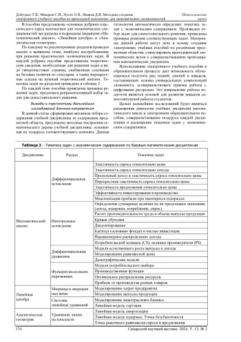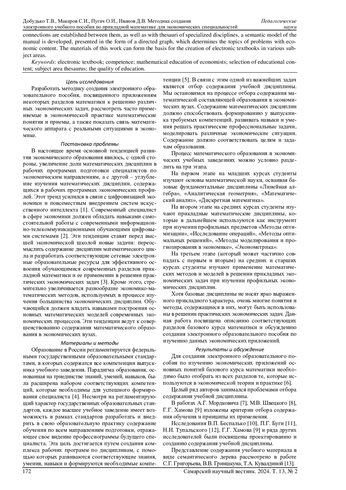 Устойчивым трендом последних десятилетий явилось, с одной стороны, увеличение доли математических дисциплин в рабочих программах подготовки специалистов по экономическим направлениям, а с другой - углубление изучения имеющихся актуальных математических дисциплин. Эта тенденция нарастает в связи с цифровизацией экономики и повсеместным внедрением систем искусственного интеллекта. В данной статье анализируется сложный комплекс проблем, связанных с формированием математических компетенций выпускников экономических вузов при подготовке кадров для цифровой экономики. Авторы отмечают, что получение данных компетенций связано как с вопросами качества подготовки специалистов, так и с карьерными ожиданиями выпускников. Дисциплины математического цикла являются неотъемлемой составной частью подготовки экономистов и менеджеров. Уверенное владение математическим аппаратом дает возможность будущему специалисту успешно освоить профильные экономические дисциплины всех циклов обучения. Фундаментальные математические дисциплины не носят ярко выраженного прикладного экономического характера, но при этом очень многие понятия и методы, содержащиеся в них, могут быть использованы в решении практических экономических задач. Данная работа посвящена описанию соответствующих разделов базового курса математики и обсуждению создания электронного образовательного пособия по изучению данных экономических приложений. В исследовании рассмотрена реализация процесса построения сетевой версии электронного учебного пособия, выявлены его структурные компоненты, приведено обоснование комплексного подхода к его проектированию. Сформирован механизм отбора содержания учебной дисциплины из содержания предметной области, предложена методика построения семантического дерева учебной дисциплины, основанная на тезаурусе соответствующего контента. Произведен отбор основных понятий и дефиниций для построения тезаурусов математических дисциплин, установлены связи между ними, а также межпредметные связи с профильными экономическими дисциплинами. Данная технология автоматически определяет тематику задач с экономическим содержанием. Материалы данной работы могут лечь в основу создания электронных учебных пособий по различным предметным областям.