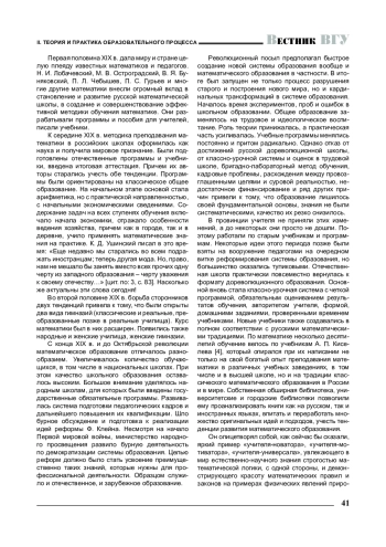 К середине XIX в. методика преподавания математики в российских школах оформилась как наука и получила мировое признание. Были подготовлены отечественные программы и учебники, введена итоговая аттестация. Причем их авторы старались учесть обе тенденции. Программы были ориентированы на классическое общее образование. На начальном этапе основой стала арифметика, но с практической направленностью, с начальными экономическими сведениями. Содержание задач на всех ступенях обучения включало начала экономики, отражало особенности ведения хозяйства, причем как в городе, так и в деревне, учило применять математические знания на практике. К. Д. Ушинский писал в это время: «Еще недавно мы старались во всем подражать иностранцам; теперь другая мода. Но, право, нам не мешало бы занять вместо всех прочих одну черту из западного образования – черту уважения к своему отечеству…» [цит. по: 3, с. 83].