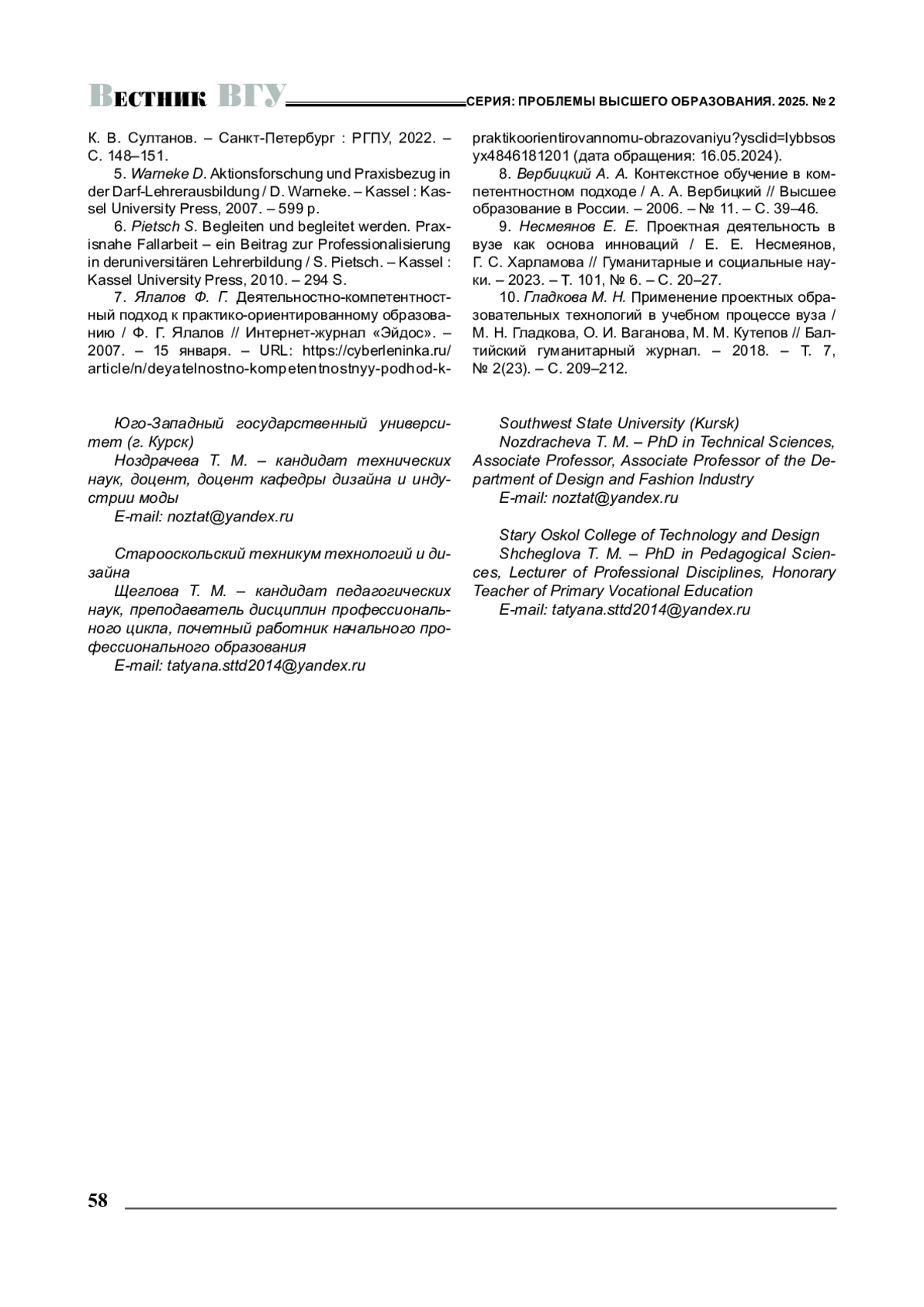7. Ялалов Ф. Г. Деятельностно-компетентностный подход к практико-ориентированному образованию / Ф. Г. Ялалов // Интернет-журнал “Эйдос”. -2007. - 15 января. - URL: https://cyberleninka.ru/article/n/deyatelnostno-kompetentnostnyy-podhod-k-praktikoorientirovannomu-obrazovaniyu?ysclid=lybbsosyx4846181201 (дата обращения: 16.05.2024). EDN: REGMZG