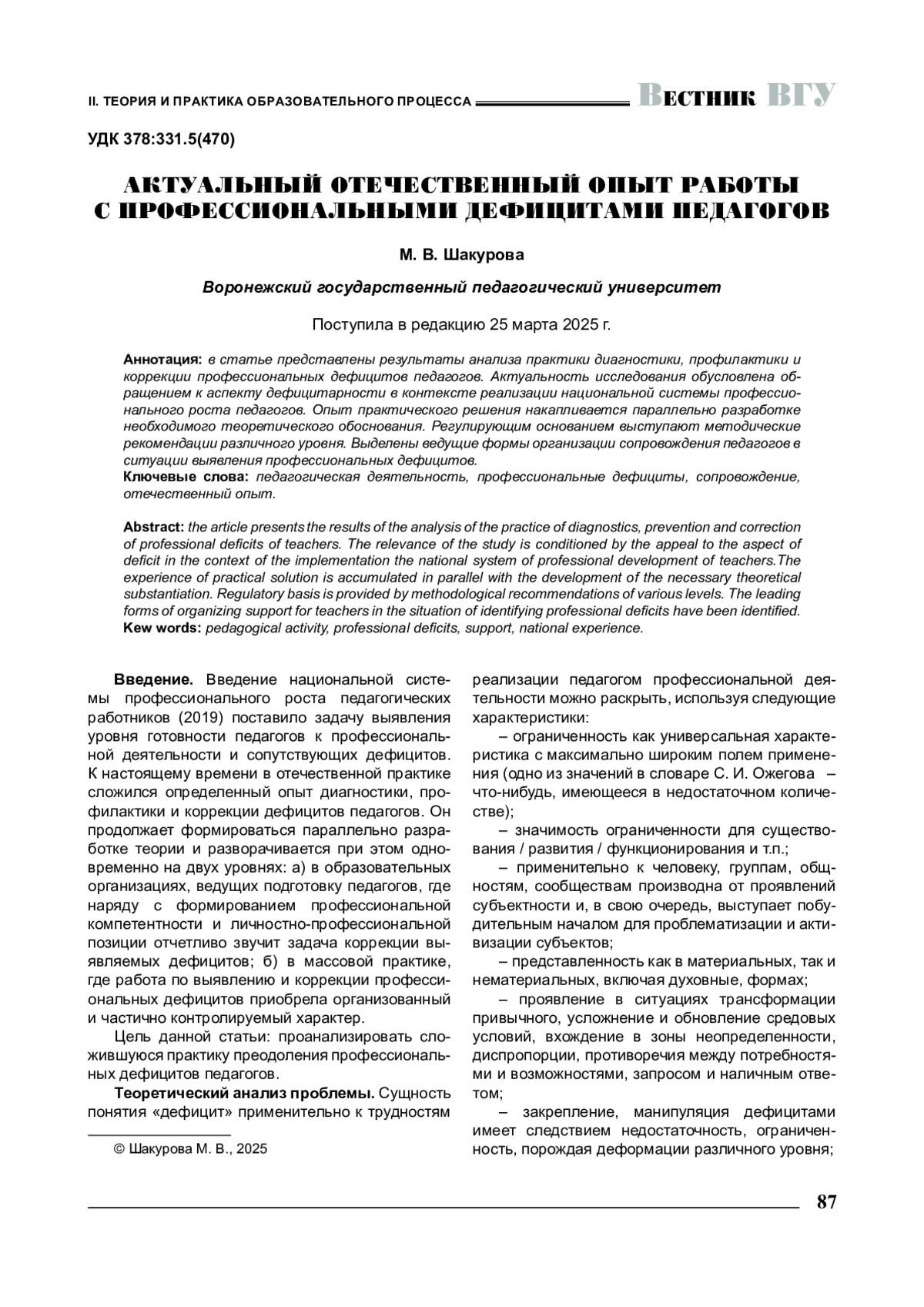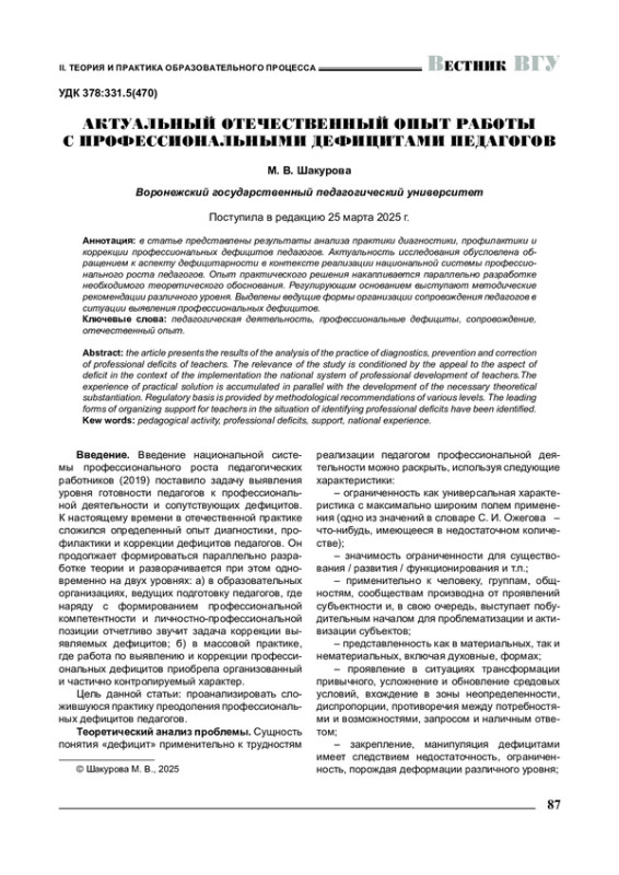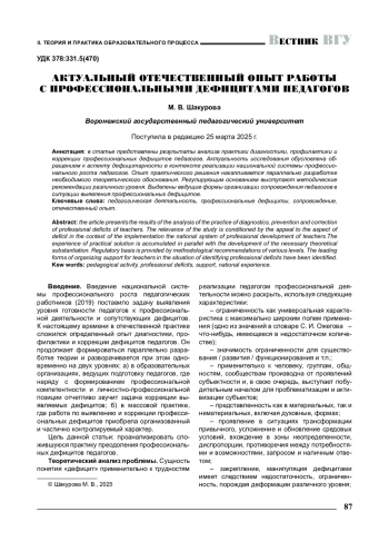 В статье представлены результаты анализа практики диагностики, профилактики и коррекции профессиональных дефицитов педагогов. Актуальность исследования обусловлена обращением к аспекту дефицитарности в контексте реализации национальной системы профессионального роста педагогов. Опыт практического решения накапливается параллельно разработке необходимого теоретического обоснования. Регулирующим основанием выступают методические рекомендации различного уровня. Выделены ведущие формы организации сопровождения педагогов в ситуации выявления профессиональных дефицитов.