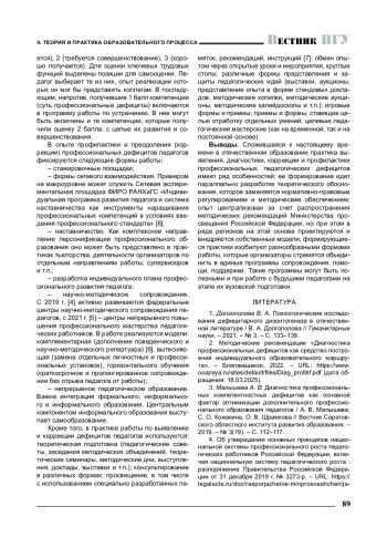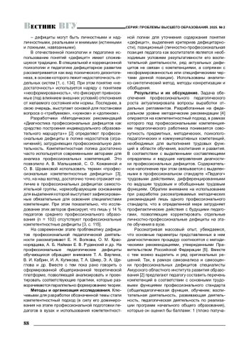 Задача обеспечения профессионального педагогического роста актуализировала вопросы выработки отдельных регламентов. Разработанные на федеральном уровне методические рекомендации [4] опираются на компетентностный подход, в рамках которого под профессиональными компетенциями педагогического работника понимается совокупность предметных, методических, психологопедагогических и коммуникативных компетенций, необходимых для выполнения трудовых функций в области обучения, воспитания и развития. В соответствии с выделенными составляющими определены и ведущие направления диагностики профессиональных дефицитов. Содержательное наполнение при этом связывается с выделенными в профессиональном стандарте «Педагог» трудовыми действиями, дифференцированными по ведущим трудовым и обобщенным трудовым функциям. Обратим внимание на использование при разработке рассматриваемых методических рекомендаций лишь одного профессионального стандарта, что в определенной мере затрудняет профилактические действия с будущими педагогами, позволяющие корректировать отдельные личностно-профессиональные дефициты на этапе обучения в вузе.
