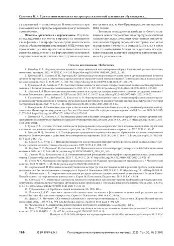 6. Гончарова Н. А. Ценностные факторы в обеспечении психологического благополучия курсантов образовательной организации Министерства внутренних дел России // Вестник Санкт-Петербургского университета МВД России. 2024. № 2(102). С. 275–285. https://doi.оrg/10.35750/2071-8284-2024-2-275-285.