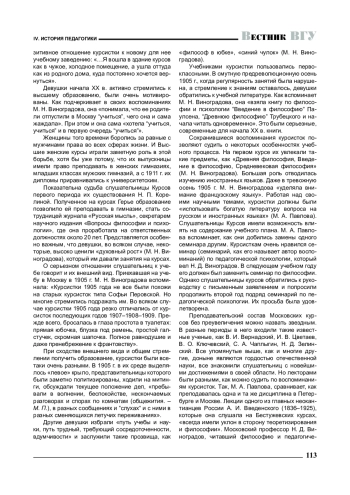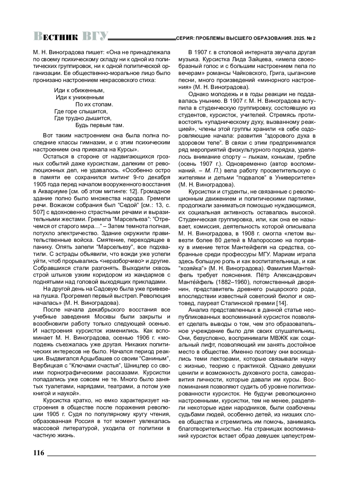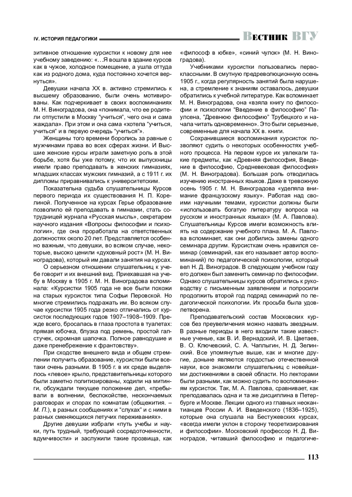 Представленные неопубликованные воспоминания выпускниц Московских высших женских курсов начала XX в. позволяют выявить взгляд курсисток на высшее женское образование как средство повышения социального статуса, способ саморазвития личности, раскрыть уровень их политизированности, отношение к преподаваемым дисциплинам и профессуре.