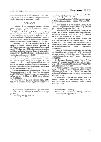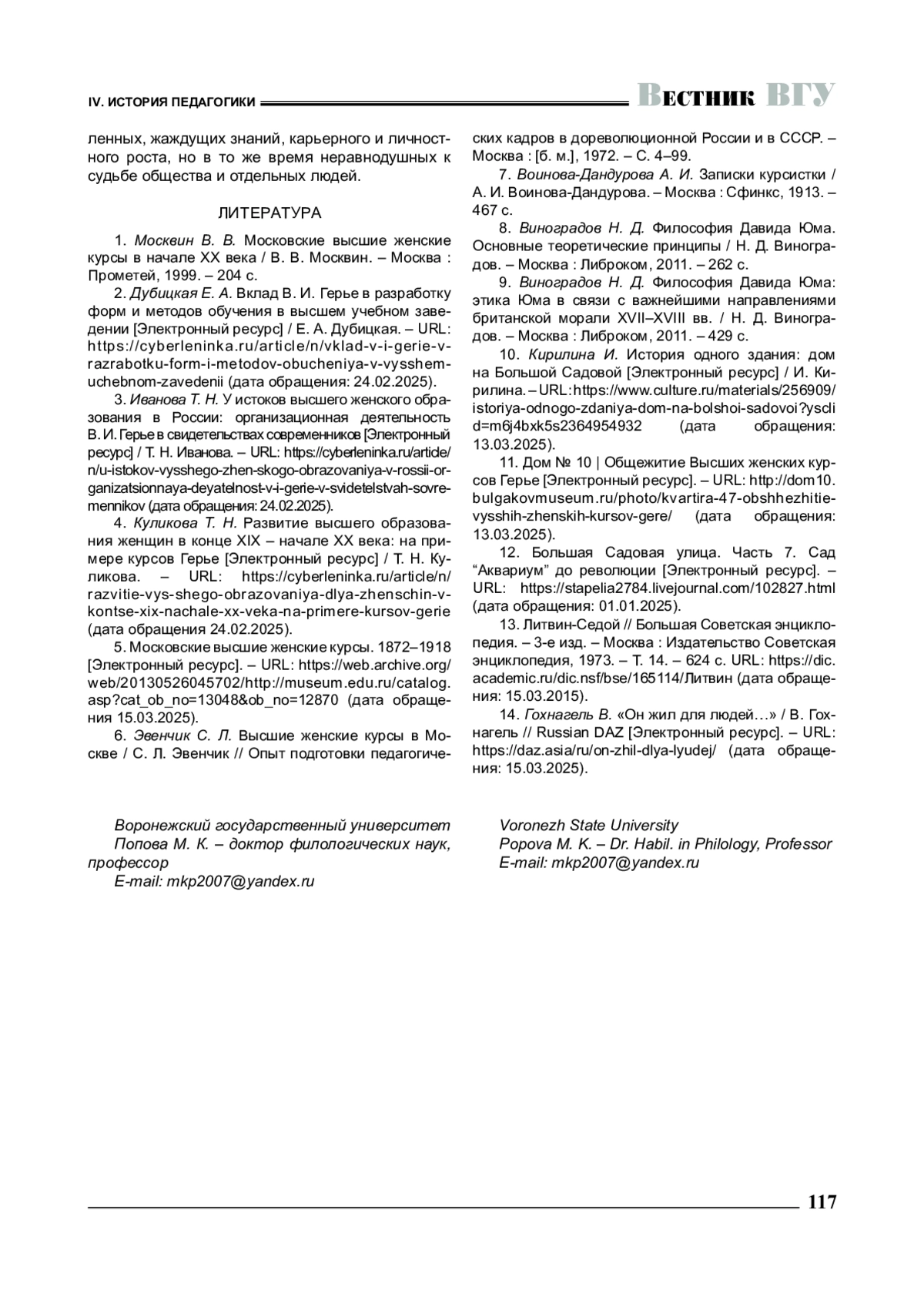 4. 	Куликова Т. Н. Развитие высшего образования женщин в конце XIX - начале XX века: на примере курсов Герье [Электронный ресурс] / Т. Н. Куликова. - URL: https://cyberleninka.ru/article/n/razvitie-vys-shego-obrazovaniya-dlya-zhenschin-v-kontse-xix-nachale-xx-veka-na-primere-kursov-gerie (дата обращения 24.02.2025).