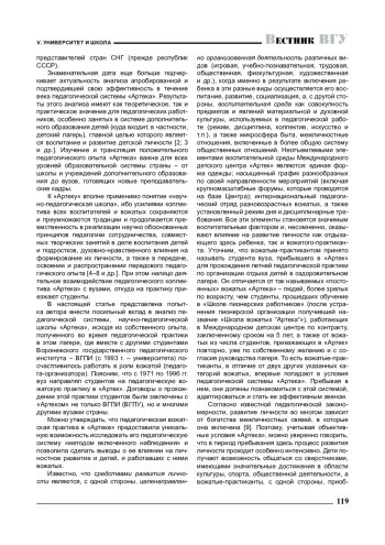 В 2025 г. легендарный детский лагерь на Крымском побережье Чёрного моря «Артек» отмечает 100-летие. В статье на основе опыта, полученного автором во время работы вожатой одного из лагерей «Артека», анализируется педагогическая система этого Международного детского центра, ключевые элементы которой являются практически неизменными на протяжении всей его вековой истории и обусловливают становление личности как детей, так и работающих с ними студентов-практикантов в роли вожатых.
