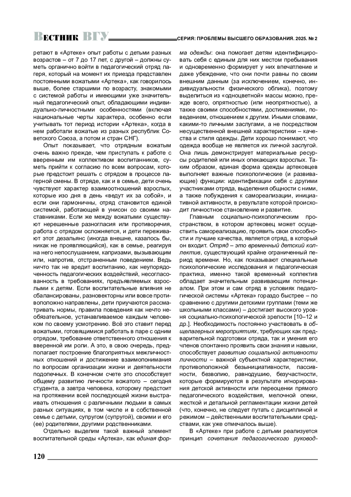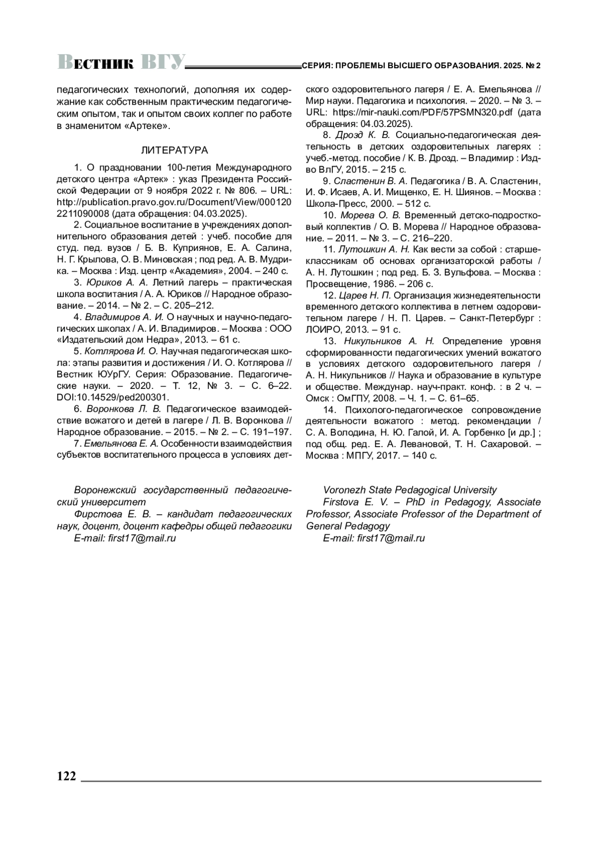 7. 	Емельянова Е. А. Особенности взаимодействия субъектов воспитательного процесса в условиях детского оздоровительного лагеря / Е. А. Емельянова // Мир науки. Педагогика и психология. - 2020. - № 3. -URL: https://mir-nauki.com/PDF/57PSMN320.pdf (дата обращения: 04.03.2025).