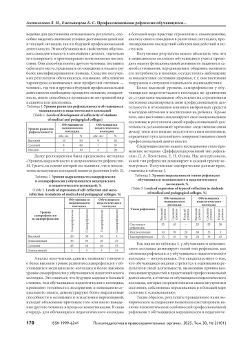 Рассматриваются психологические характеристики профессиональной рефлексии обучающихся профессиональных образовательных организаций — будущих специалистов среднего звена. Цель — выявление психологических особенностей профессиональной рефлексии обучающихся профессиональных образовательных организаций. Материалы и методы. В исследовании использовались следующие методики: «Определение уровня развития рефлексивности» А. В. Карпова, «Уровень выраженности и направленности рефлексии» М. Гранта, «Дифференцированный тип рефлексии» Д. А. Леонтьева, Е. Н. Осина. Выборку составили 40 обучающихся профессиональных образовательных организаций. Результаты и обсуждение. Выделяются психологические характеристики профессиональной рефлексии обучающихся медицинского и педагогического колледжей, определяющие их представление о себе как будущем профессионале. Приводятся данные анализа категории «профессиональная рефлексия», а также результаты сравнительного анализа особенностей профессиональной рефлексии обучающихся, полученные нами в процессе эмпирического исследования. Выводы. Профессиональная рефлексия обучающихся профессиональных образовательных организаций имеет особенности, к которым можно отнести способность анализировать и оценивать свои «шаги» в профессию, умение сопереживать и проникать во внутренний мир другого человека, проявлять эмпатию, толерантность, чуткость, способность осознавать и осмысливать свои переживания по поводу вхождения в профессию, прогнозировать последствия собственных профессиональных действий.