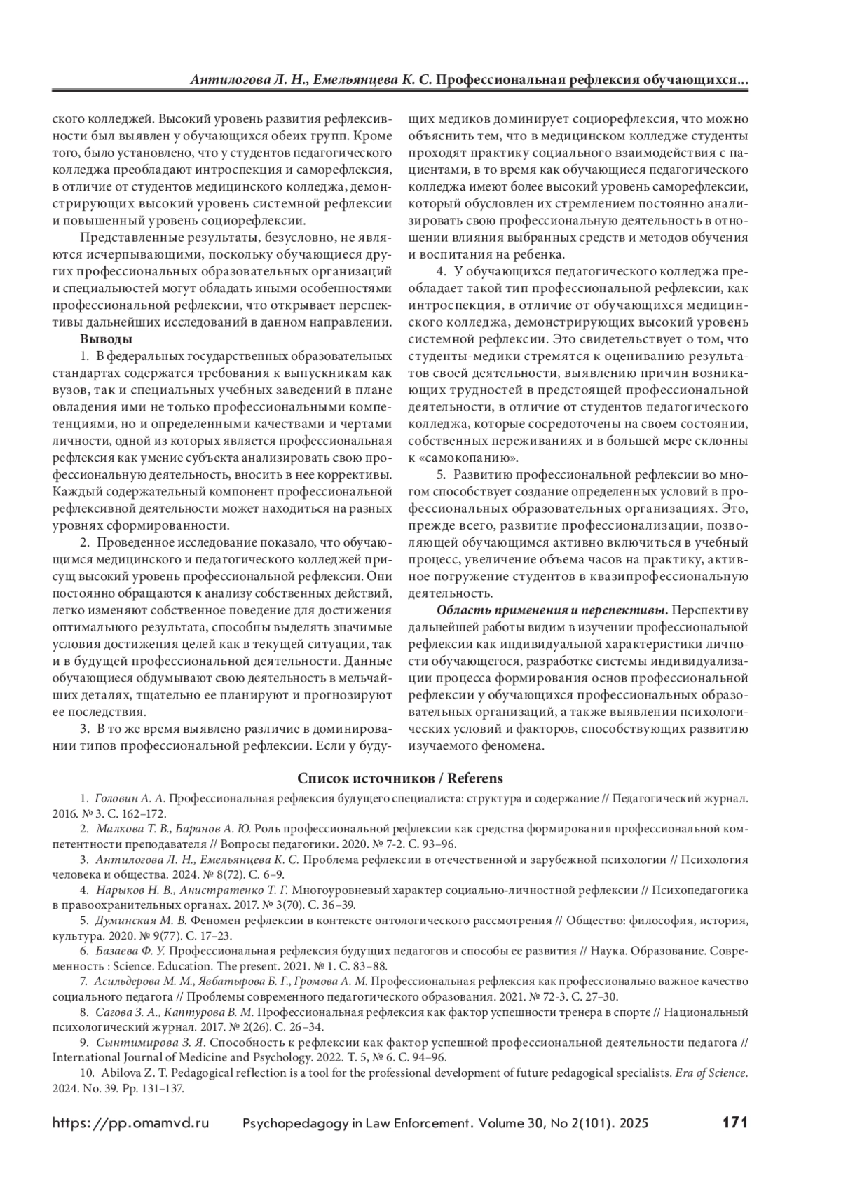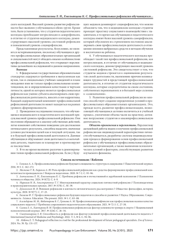 1. Головин А. А. Профессиональная рефлексия будущего специалиста: структура и содержание // Педагогический журнал. 2016. № 3. С. 162–172.