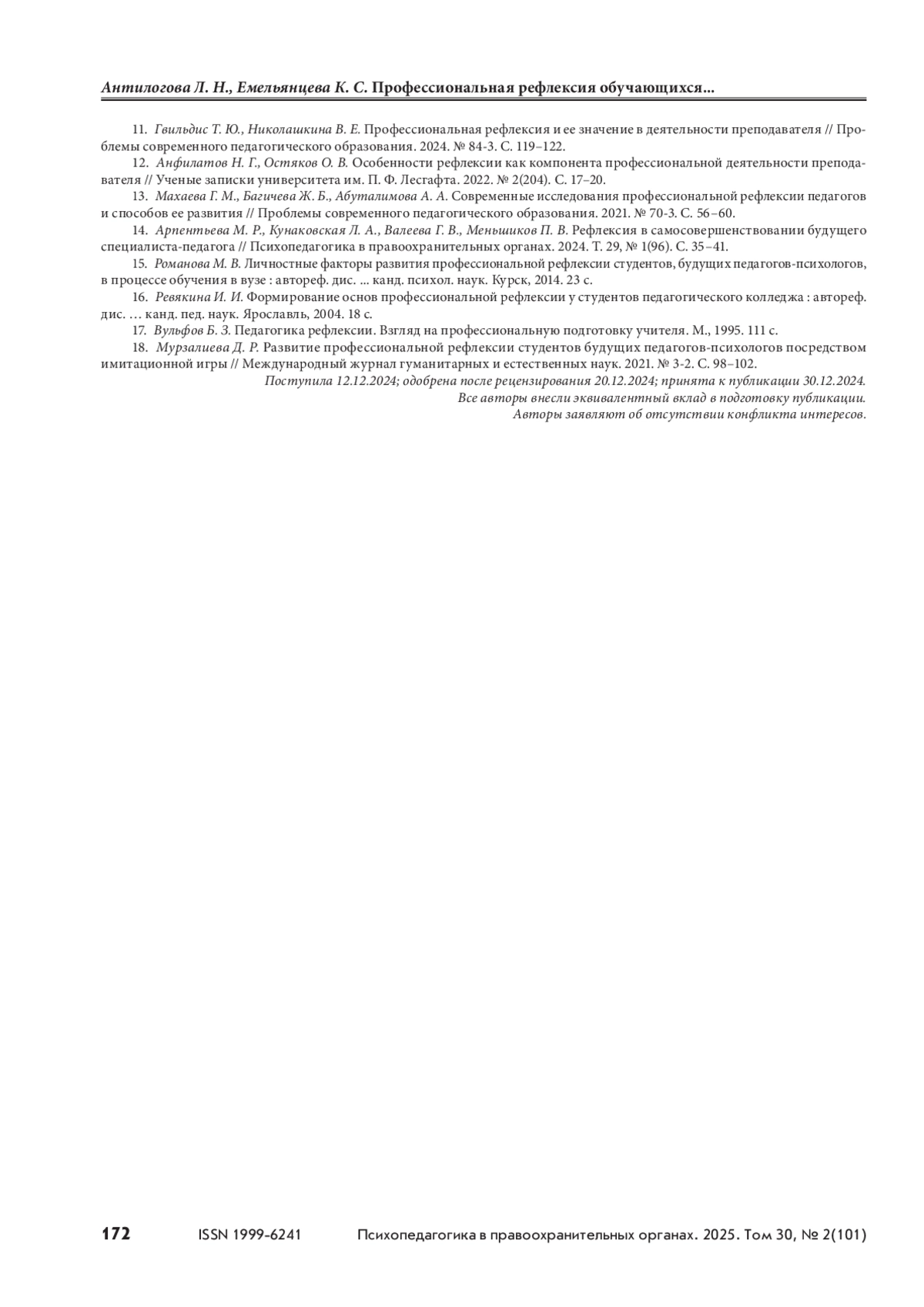 14. Арпентьева М. Р., Кунаковская Л. А., Валеева Г. В., Меньшиков П. В. Рефлексия в самосовершенствовании будущего специалиста-педагога // Психопедагогика в правоохранительных органах. 2024. Т. 29, № 1(96). С. 35–41.