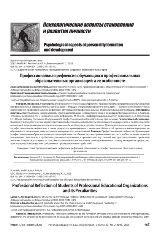 3. Антилогова Л. Н., Емельянцева К. С. Проблема рефлексии в отечественной и зарубежной психологии // Психология человека и общества. 2024. № 8(72). С. 6–9.