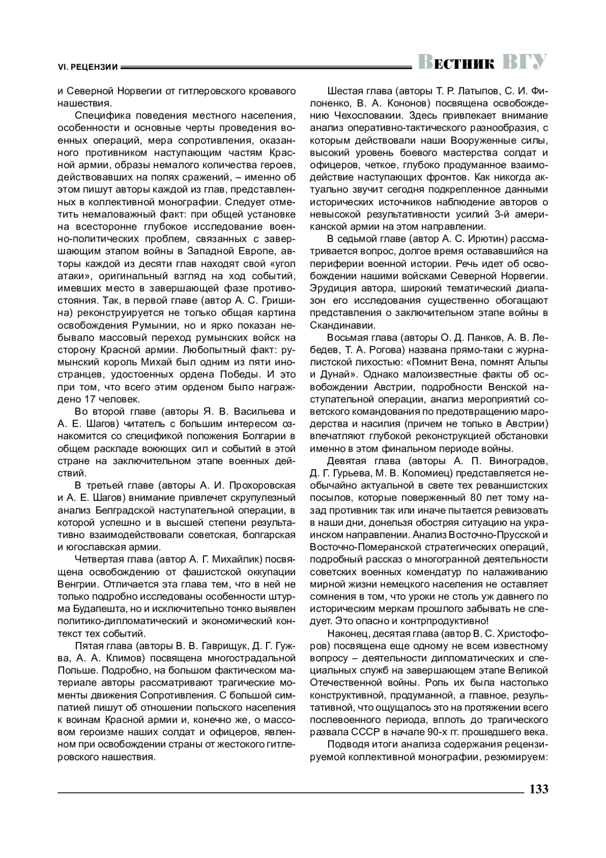 Рецензируемое издание исключительно актуально в современных условиях. В его 10 главах рассматриваются и тщательно анализируются события, имевшие место на последнем этапе освободительной войны с гитлеризмом. Подробно и скрупулезно, на большом источниковом материале исследуются наступательные операции по освобождению стран Восточной Европы и Северной Норвегии. Можно с уверенностью говорить о том, что эта книга займет свое достойное место в вузовских библиотеках и будет востребована в образовательном процессе при изучении одного из самых решающих и самых знаменательных для судеб страны периодов ее истории.