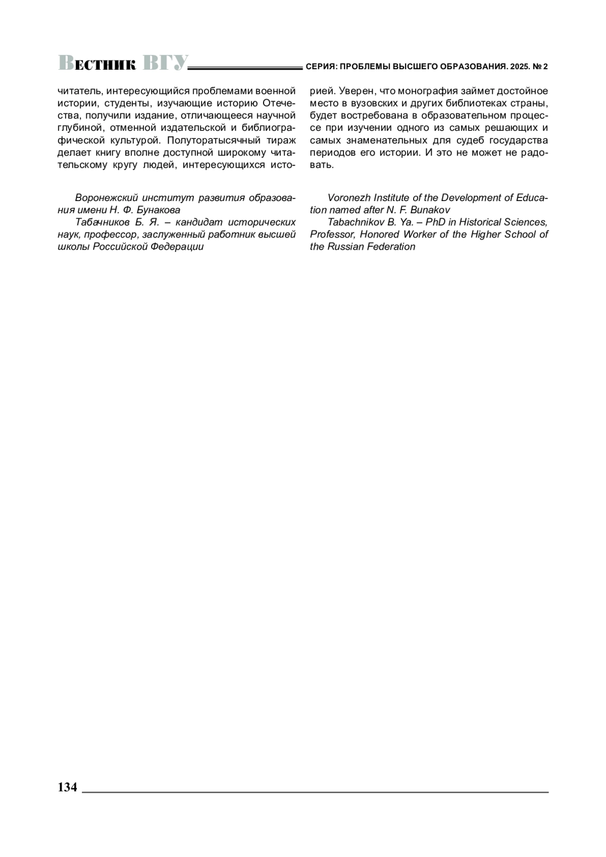 В год празднования 80-летия Победы советского народа в Великой Отечественной войне, объявленный Указом Президента Российской Федерации В. В. Путина Годом защитника Отечества, работа всех вузов страны проходит под знаком этого значимого события, имеющего без преувеличения исторический, геополитический и экзистенциальный смыслы. В связи с этим редакция серии «Проблемы высшего образования» журнала «Вестник Воронежского государственного университета» провела интервью с ректорами ряда региональных вузов, чтобы получить развернутую картину деятельности вузов, направленной на сохранение исторической памяти и патриотическое и гражданское воспитание студентов, а также с целью ознакомить научно-педагогическую общественность с эффективными практиками вузовской жизни, которые могут быть масштабированы на работу самых разных высших учебных заведений.
