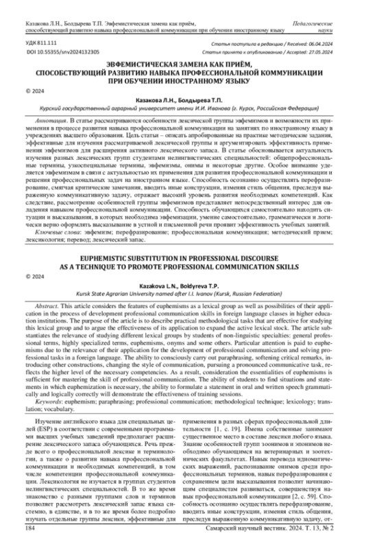 В статье рассматриваются особенности лексической группы эвфемизмов и возможности их применения в процессе развития навыка профессиональной коммуникации на занятиях по иностранному языку в учреждениях высшего образования. Цель статьи - описать апробированные на практике методические задания, эффективные для изучения рассматриваемой лексической группы и аргументировать эффективность применения эвфемизмов для расширения активного лексического запаса. В статье обосновывается актуальность изучения разных лексических групп студентами нелингвистических специальностей: общепрофессиональные термины, узкоспециальные термины, эвфемизмы, онимы и некоторые другие. Особое внимание уделяется эвфемизмам в связи с актуальностью их применения для развития профессиональной коммуникации и решения профессиональных задач на иностранном языке. Способность осознанно осуществлять перефразирование, смягчая критические замечания, вводить иные конструкции, изменяя стиль общения, преследуя выраженную коммуникативную задачу, отражает высокий уровень развития необходимых компетенций. Как следствие, рассмотрение особенностей группы эвфемизмов представляет непосредственный интерес для овладения навыком профессиональной коммуникации. Способность обучающихся самостоятельно находить ситуации и высказывания, в которых необходима эвфемизации, умение самостоятельно, грамматически и логически верно оформлять высказывание в устной и письменной речи проявит эффективность учебных занятий.