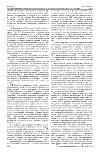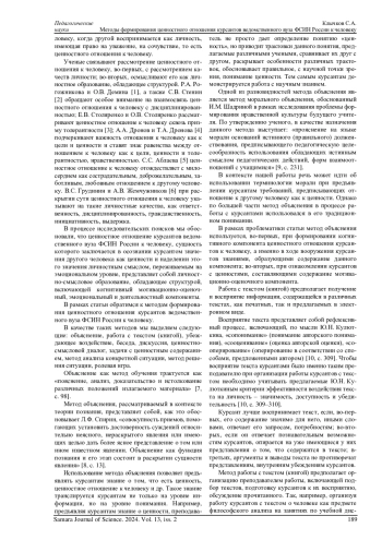 В статье актуализируется проблема формирования ценностного отношения курсантов ведомственного вуза ФСИН России к человеку как личностному образованию, обладающему структурой, включающей когнитивный, мотивационно-оценочный, эмоциональный и деятельностный компоненты. Обосновывается возможность использования объяснения, работы с текстом (книгой), убеждающего воздействия, беседы, дискуссии, ценностно-смыслового диалога, задач с ценностным содержанием, метода анализа конкретной ситуации, метода решения ситуации, ролевой игры в качестве методов формирования ценностного отношения курсантов ведомственного вуза ФСИН России к человеку. Раскрываются результаты реализации указанных методов. 1) Метод объяснения позволяет предъявлять курсантам знание о том, что есть ценность, ценностное отношение к человеку не только на уровне информации, но на уровне понимания; 2) метод работы с текстом (книгой) обеспечивает вооружение курсантов знаниями, образующими содержание когнитивного компонента ценностного отношения к человеку; 3) метод убеждающего воздействия способствует тому, что знание о ценности, о человеке и др. воспринимается курсантами не только на уровне информации, но и ложится в основу идейно-нравственных принципов личности курсанта; 4) метод ценностно-смыслового диалога обеспечивает осознание и присвоение курсантом как значимых еще недостающих курсанту ценностей; 5) метод задачи с ценностным содержание позволяет курсантам самим вычленить ценности в содержании задачи, обосновав свой выбор; 6) метод ролевой игры обеспечивает ориентацию на реализацию соответствующих отношений во взаимодействии с другими людьми. Приводятся примеры использования данных методов в образовательном процессе ведомственного вуза ФСИН России.