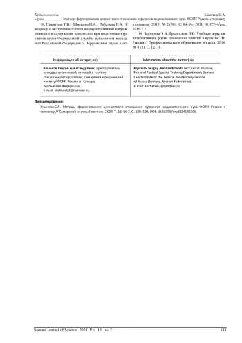 17. Самойлик Н.А. Применение игровых техник при формировании профессионально-ценностных ориентаций курсантов ведомственных вузов ФСИН России // Уголовно-исполнительная система сегодня: взаимодействие науки и практики: мат-лы юбилейной XX всерос. науч.-практ. конф. (Новокузнецк, 28-29 октября 2020 г.) / отв. ред. А.Г. Чириков. Новокузнецк: Кузбасский институт ФСИН, 2020. С. 385-388. EDN: DMQKBC