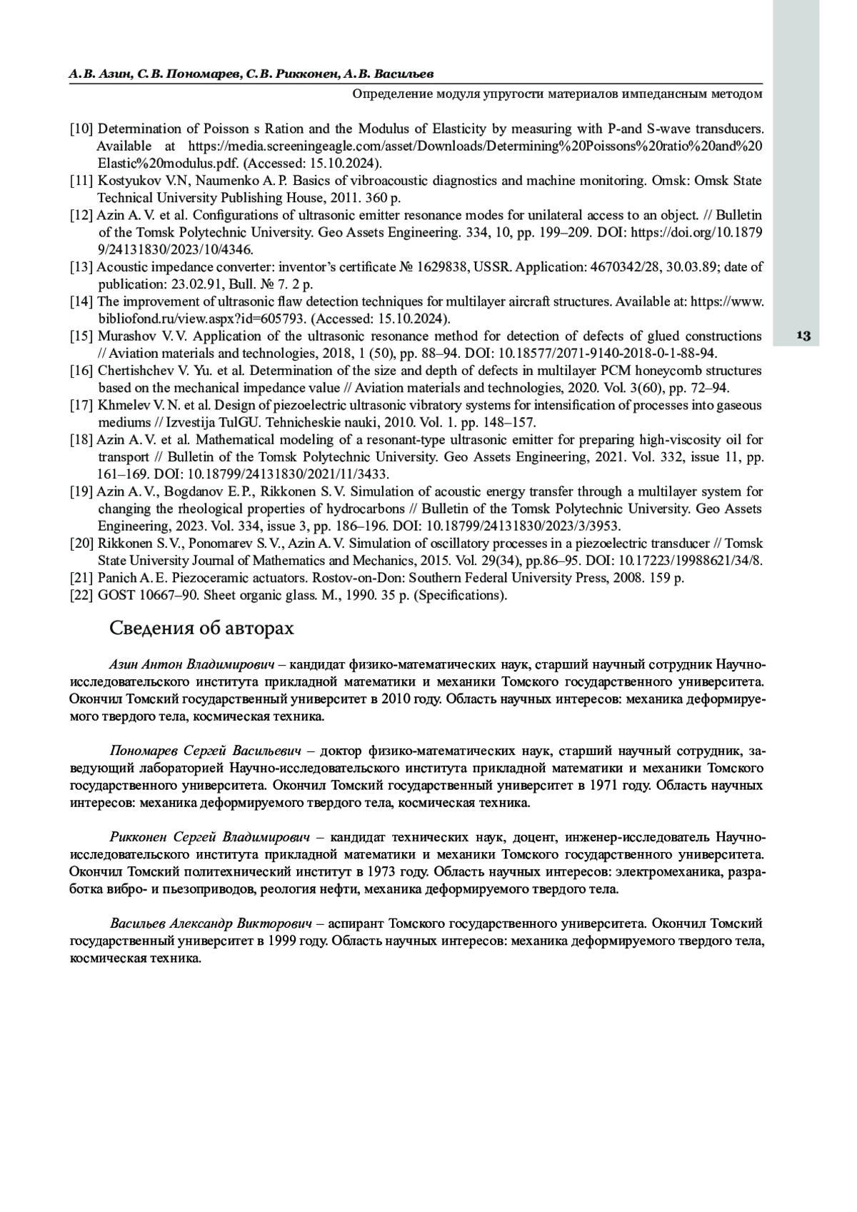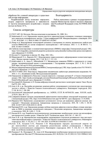 Эффективно применяемый импедансный метод неразрушающего контроля для элементов космической техники является сравнительным методом обнаружения дефектов материалов. Однако определение деформационных характеристик материалов, в частности модуля упругости, этим методом затруднительно. Цель работы: расширение возможностей импедансного метода для определения модуля упругости материала. Предложен метод локального динамического воздействия на поверхность материала, в котором возможен анализ составляющих механического импеданса с определением модуля упругости материала. Устройство, реализующее данный метод, представляет собой ультразвуковой излучатель с индентором для контактного воздействия на поверхность исследуемого материала. В конструкцию устройства включены датчики ускорения и силы. Ультразвуковой излучатель при одностороннем доступе к объекту оказывает минимальное силовое воздействие на исследуемый материал, что особенно важно при неразрушающем контроле. Для получения информации о физико-механических характеристиках материала используется частотный диапазон, при котором все сигналы датчиков имеют гармоническую форму. В режиме гармонических колебаний колебательная система «устройство-исследуемый материал» работает как единое целое. Наличие режима гармонических колебаний позволяет при обработке экспериментальных данных о колебательной системе использовать простые математические методы (символический метод анализа систем и правила преобразования электрических цепей) без потери информации об объекте. Предложенный метод позволяет определять модуль упругости материалов в зависимости от частоты механического воздействия с погрешностью не более 10 %.