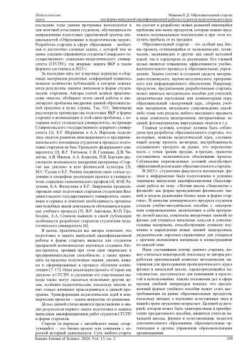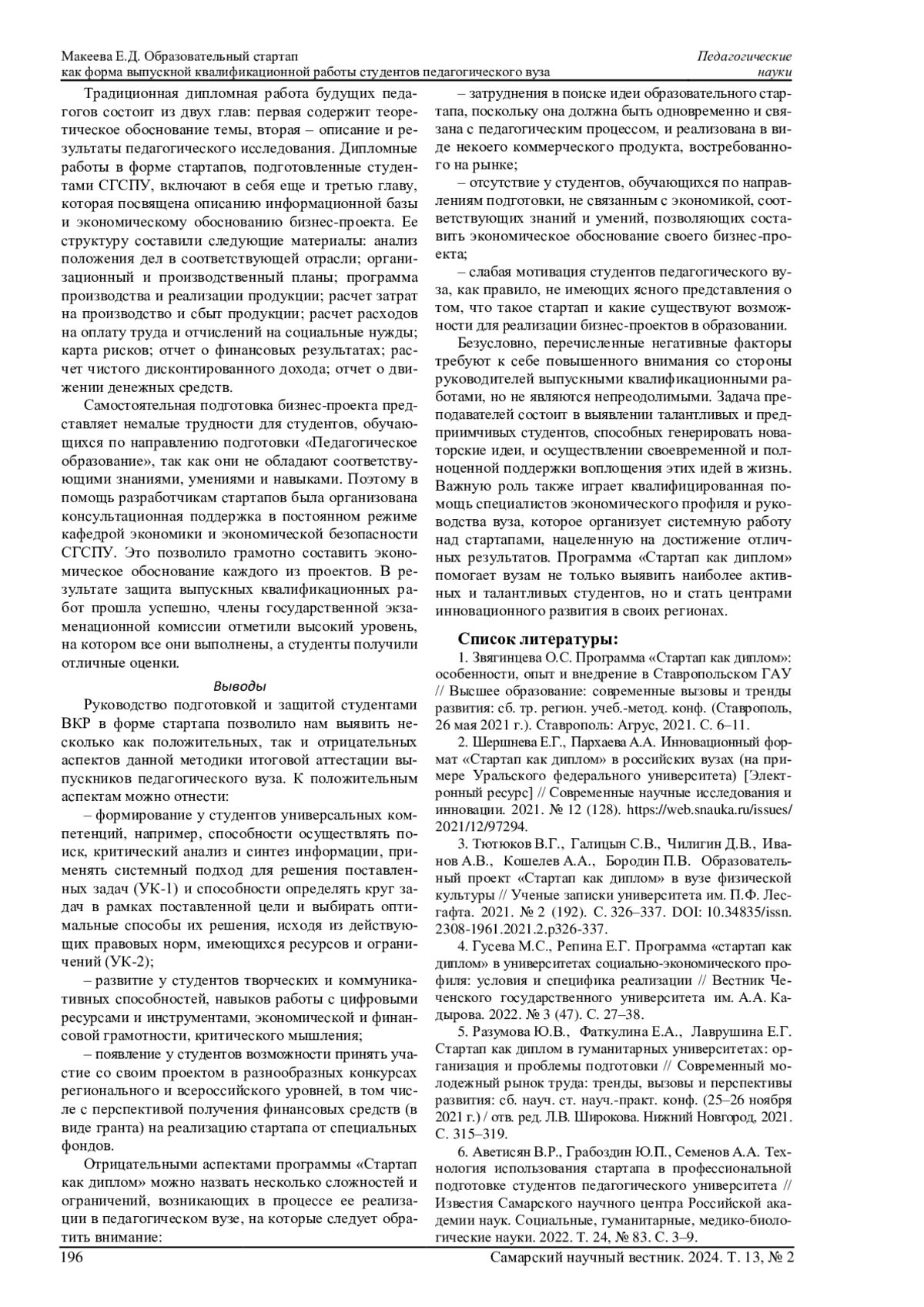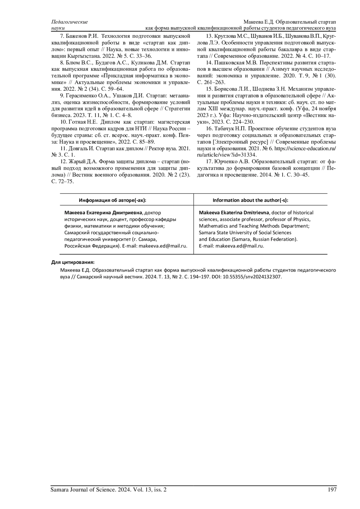 13. 	Круглова М.С., Шуванов И.Б., Шуванова В.П., Круглова Л.Э. Особенности управления подготовкой выпускной квалификационной работы бакалавра в виде стартапа // Современное образование. 2022. № 4. С. 10-17. EDN: UUUHYR