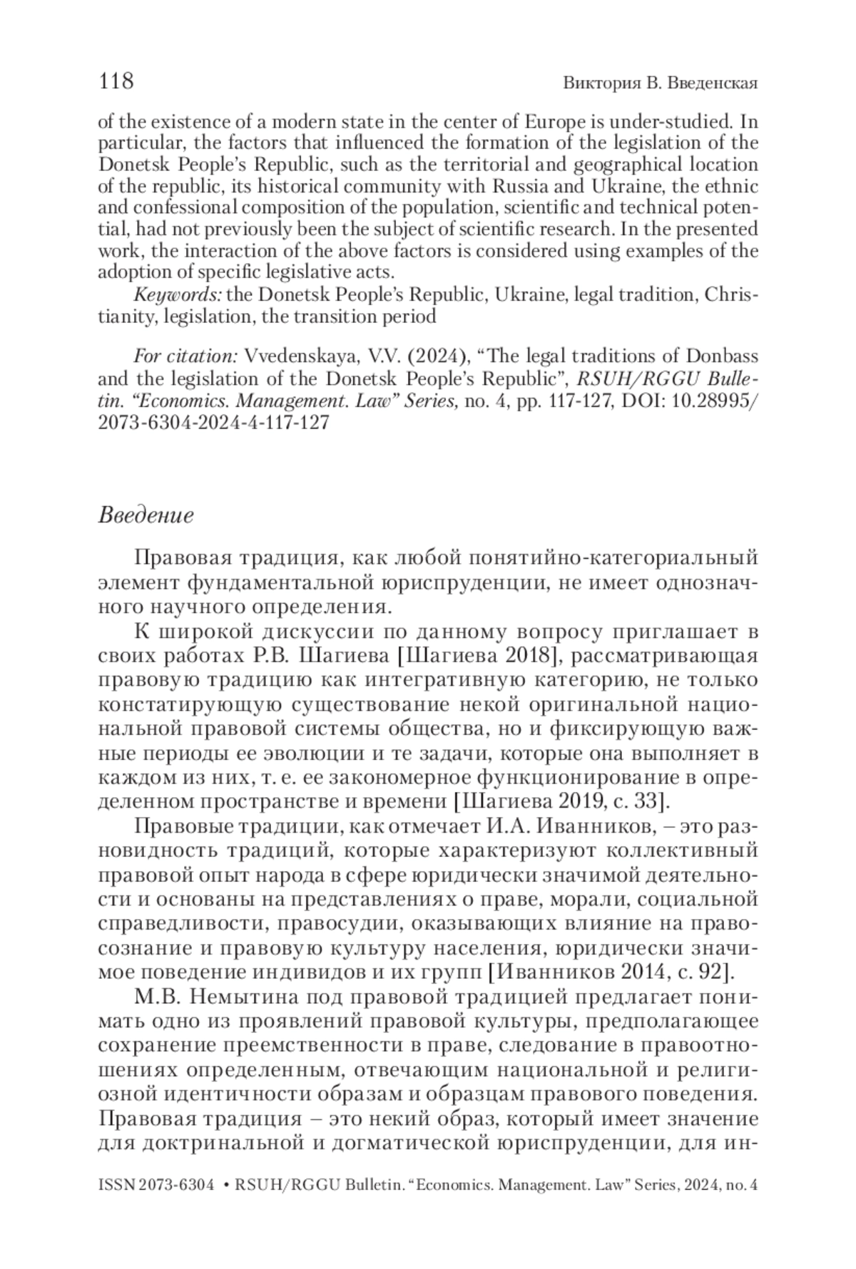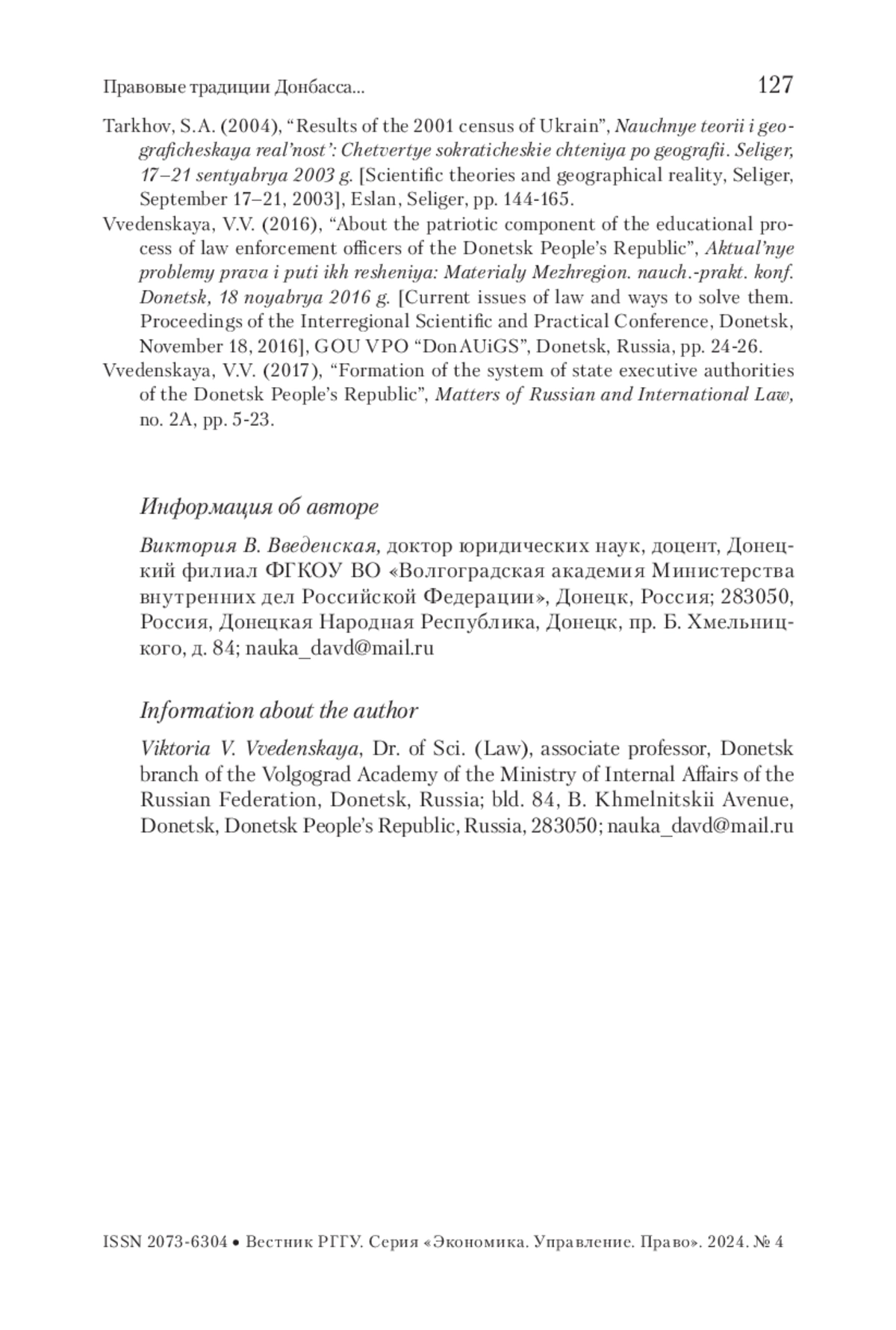 2. Введенская 2017 - Введенская В.В. Становление системы органов государственной исполнительной власти Донецкой Народной Республики // Вопросы российского и международного права. 2017. № 2А. С. 5-23.