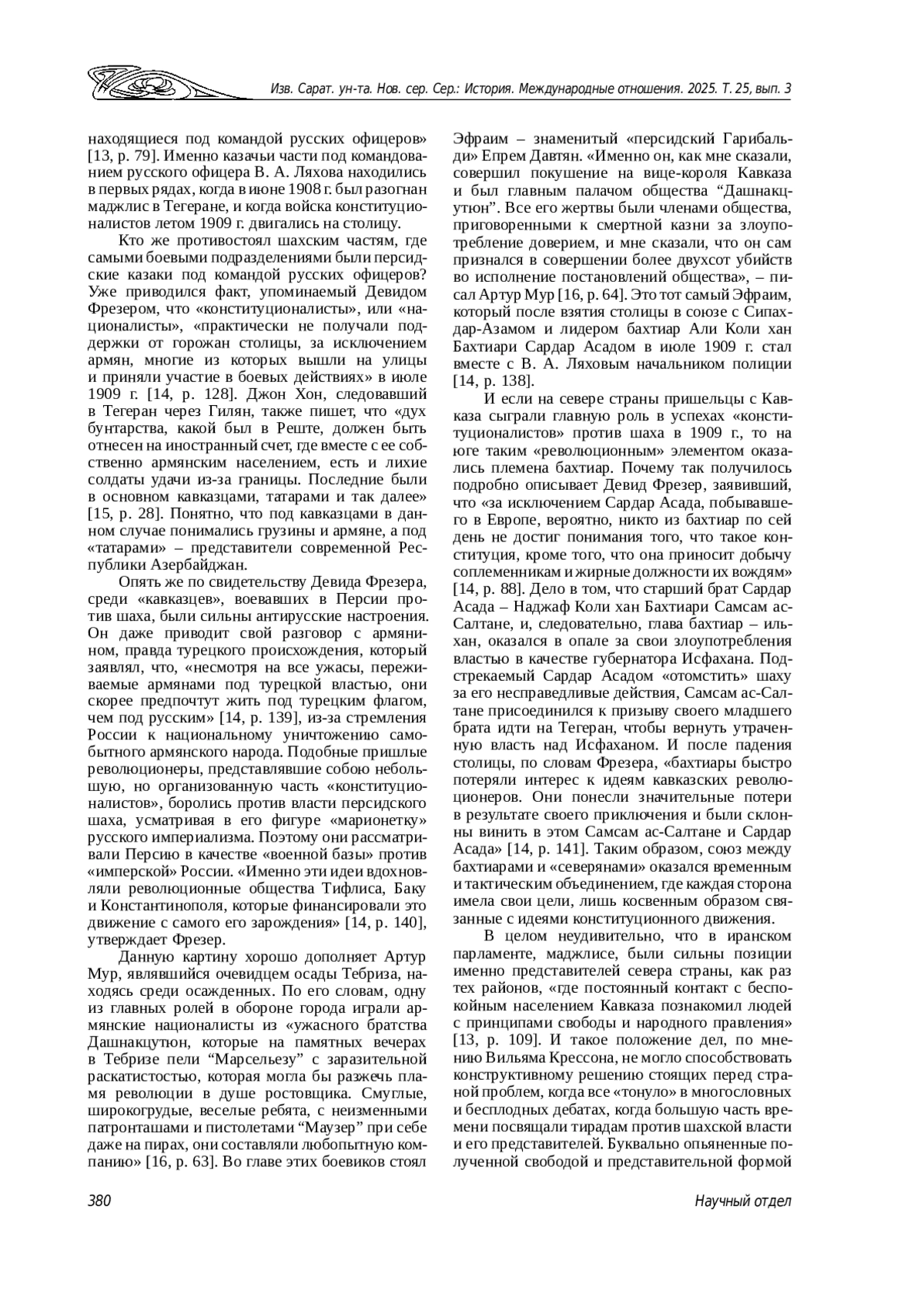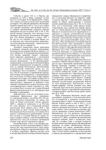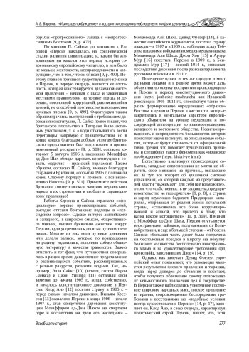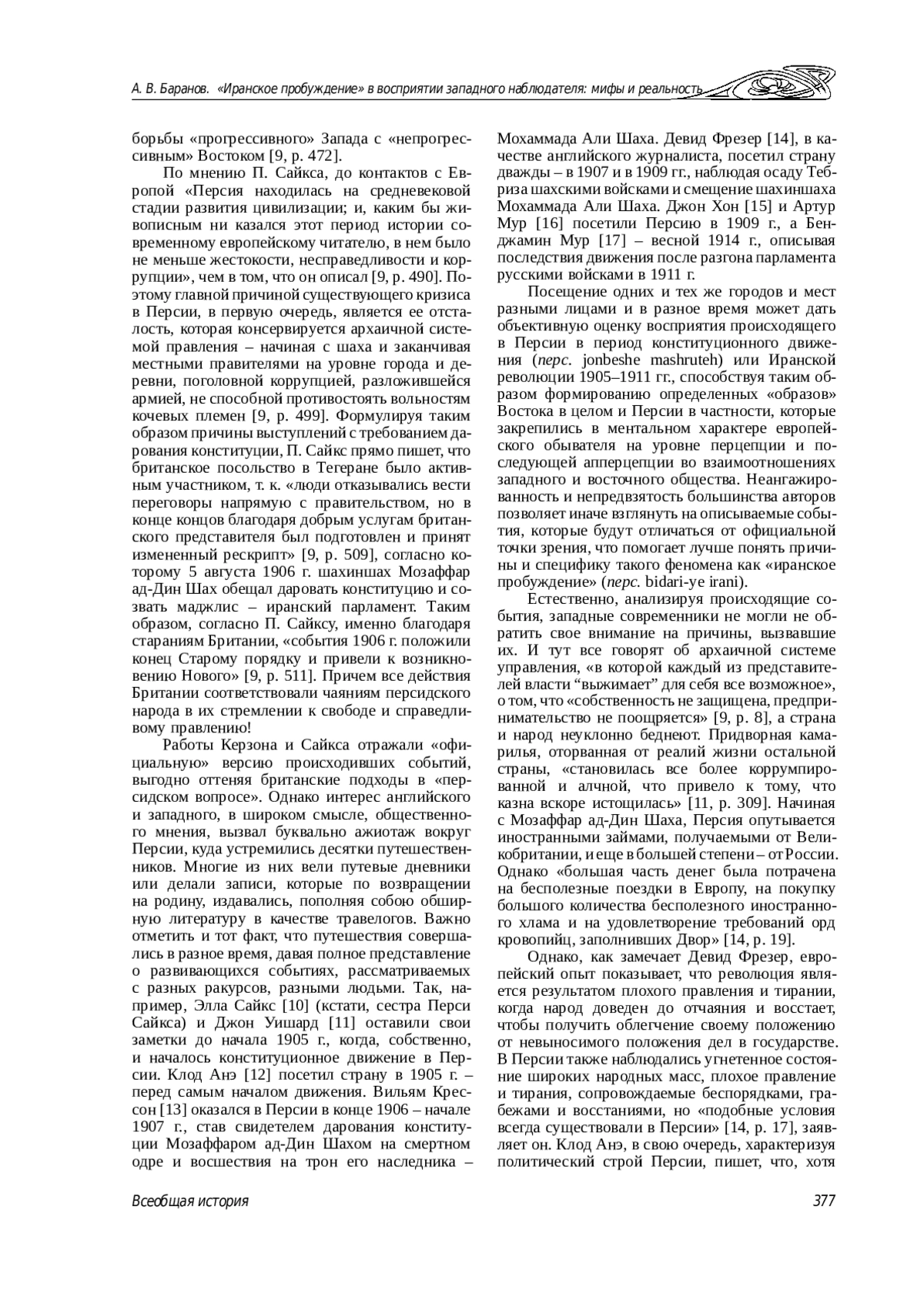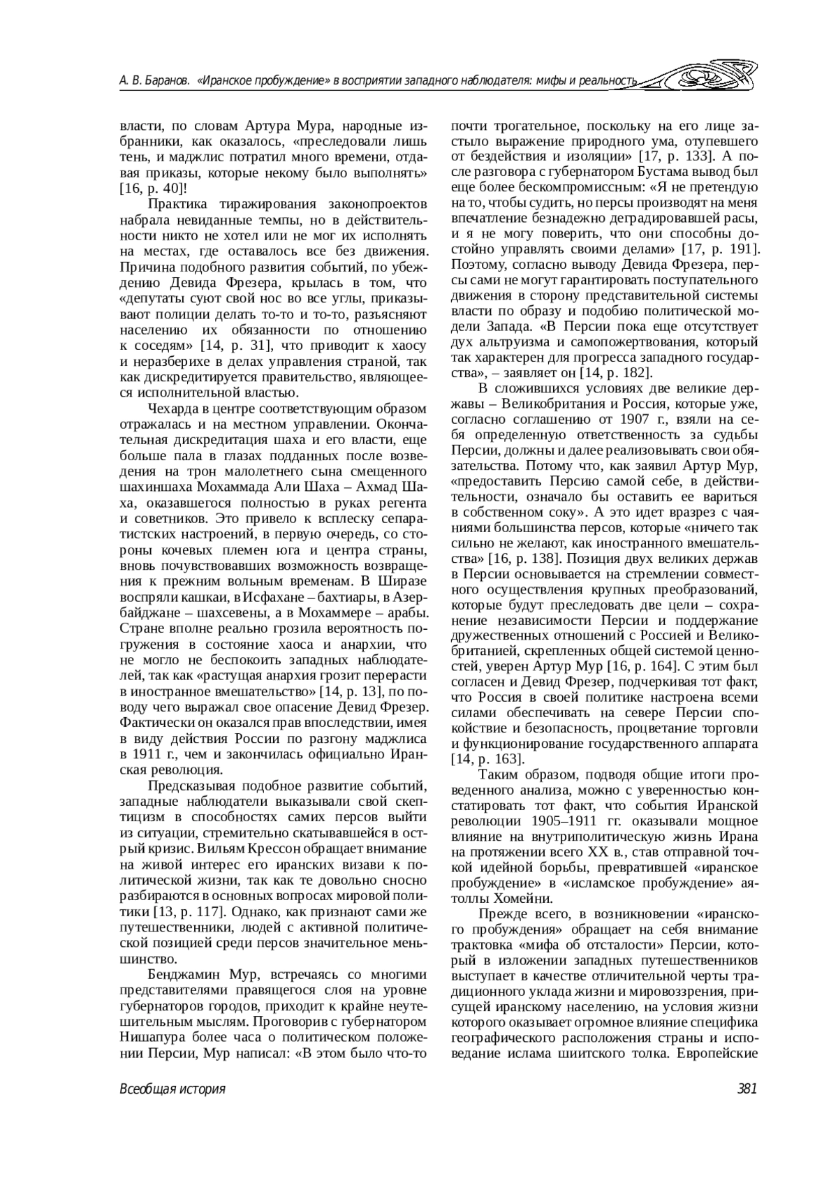 В статье делается попытка провести анализ материалов западных травелогов, касающихся событий в Иране 1905–1911 гг., ставших мощным идейным фактором во внутриполитической жизни страны, впервые столь мощно и очевидно столкнувшейся с воздействием западных идей, центральной частью которых стали представительная форма власти, конституция и институт маджлиса. Не случайно эти события получили наименование «иранского пробуждения» (перс. bidari-ye irani) в идейном плане и «конституционного движения» (перс. jonbeshe mashruteh) в политическом. Активно распространявшаяся в официальных западных медиа и в трудах известных колониальных деятелей Великобритании, игравшей на протяжении всего XIX в. роль ведущей державы западного мира, точка зрения в отношении вестернизации Персии в ходе «иранского пробуждения» оказалась явно однобокой и упрощавшей основной ход событий. Привлечение в качестве дополнительных источников материалов многочисленных травелогов западных путешественников, посещавших в исследуемый период страну, не ангажированных своей профессиональной принадлежностью к властным институтам Великобритании, позволили взглянуть на происходящее более объективно и не предвзято.