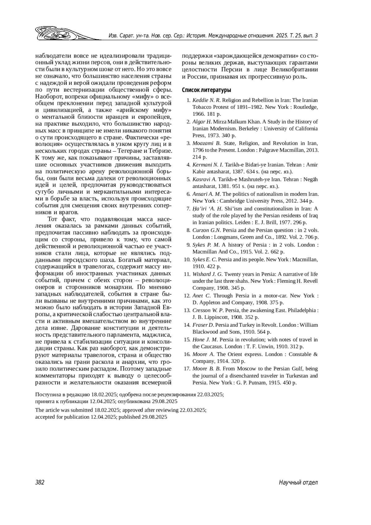 1. 	Keddie N. R. Religion and Rebellion in Iran: The Iranian Tobacco Protest of 1891-1982. New York: Routledge, 1966. 181 р.