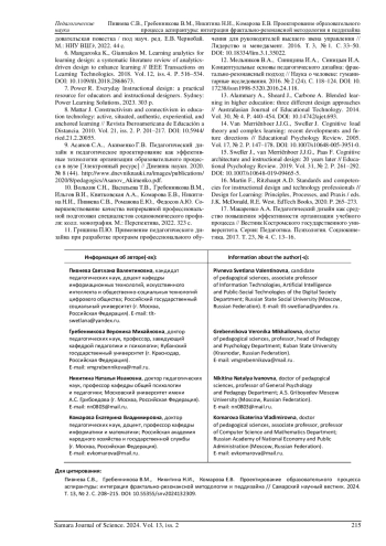 5. 	Ефимова Е.А., Корешникова Ю.Н., Давлатова М.А. Педагогический дизайн: российская и зарубежная исследовательская повестка / под науч. ред. Е.В. Чернобай. М.: НИУ ВШЭ, 2022. 44 с.