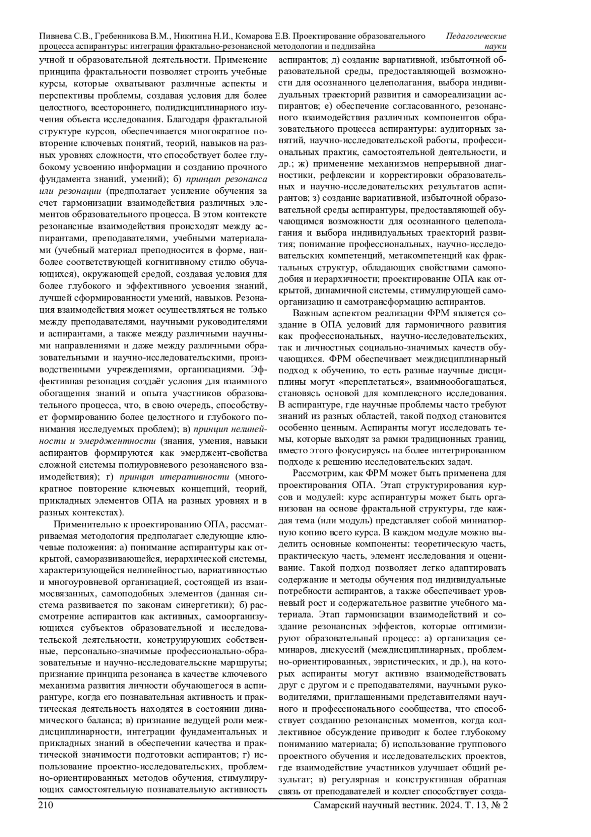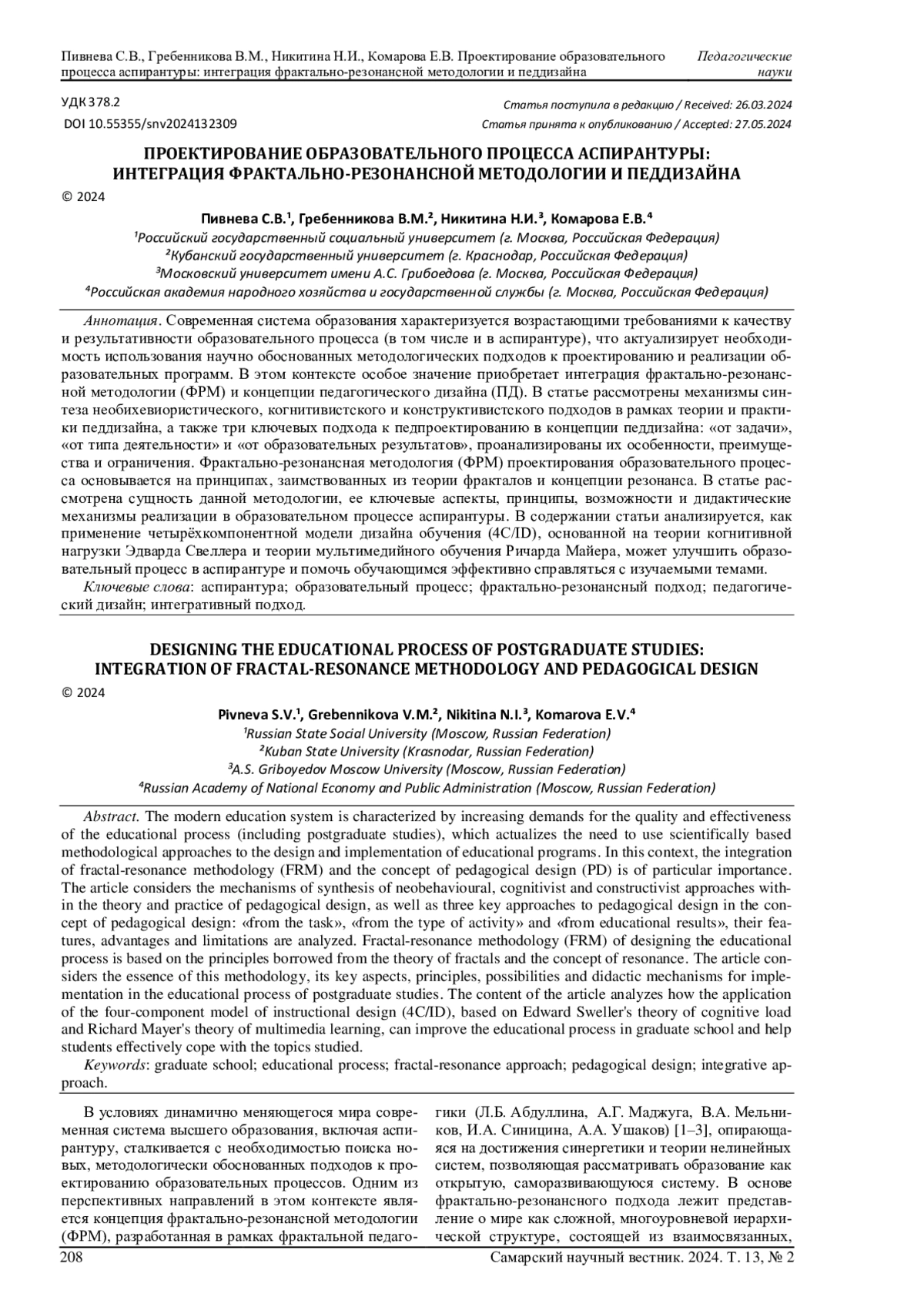 Современная система образования характеризуется возрастающими требованиями к качеству и результативности образовательного процесса (в том числе и в аспирантуре), что актуализирует необходимость использования научно обоснованных методологических подходов к проектированию и реализации образовательных программ. В этом контексте особое значение приобретает интеграция фрактально-резонансной методологии (ФРМ) и концепции педагогического дизайна (ПД). В статье рассмотрены механизмы синтеза необихевиористического, когнитивистского и конструктивистского подходов в рамках теории и практики педдизайна, а также три ключевых подхода к педпроектированию в концепции педдизайна: «от задачи», «от типа деятельности» и «от образовательных результатов», проанализированы их особенности, преимущества и ограничения. Фрактально-резонансная методология (ФРМ) проектирования образовательного процесса основывается на принципах, заимствованных из теории фракталов и концепции резонанса. В статье рассмотрена сущность данной методологии, ее ключевые аспекты, принципы, возможности и дидактические механизмы реализации в образовательном процессе аспирантуры. В содержании статьи анализируется, как применение четырёхкомпонентной модели дизайна обучения (4С/ID), основанной на теории когнитивной нагрузки Эдварда Свеллера и теории мультимедийного обучения Ричарда Майера, может улучшить образовательный процесс в аспирантуре и помочь обучающимся эффективно справляться с изучаемыми темами.