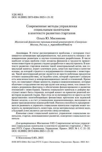 В статье рассматриваются проблемы, с которыми сталкиваются начинающие предприниматели, чья деятельность связана с инновационным развитием и научно-техническими разработками. В числе наиболее острых проблем стоит нехватка финансов и трудности привлечения инвесторов на ранних стадиях разработки и запуска проекта. В контексте развития стартапов именно такой нематериальный актив, как социальный капитал, играет ключевую роль, зачастую выступая в качестве основы, на которой строятся и поддерживаются отношения с инвесторами. Такой многогранный ресурс является не просто побочным продуктом сетевого взаимодействия, он подобен клею, который скрепляет сложную сеть межличностных и межорганизационных связей и отношений. Кроме того, он охватывает общие ценности, нормы и взаимопонимание, которые облегчают сотрудничество внутри групп или между ними, тем самым становясь решающим фактором в обеспечении финансирования и развитии отношений с инвесторами. Уровень социального капитала и доверия выступает может быть стержнем, который влияет на принятие решений инвесторов на ранней стадии. При этом он культивируется не просто за счет представления многообещающих финансовых прогнозов или надежной бизнес-модели, а за счет установления взаимопонимания, выходящего за рамки транзакционных взаимодействий. Именно способность предпринимателя развивать и управлять социальным капиталом стартапа может повлиять на приверженность инвестора, когда материальных активов мало, а будущий успех является достаточно спекулятивным.