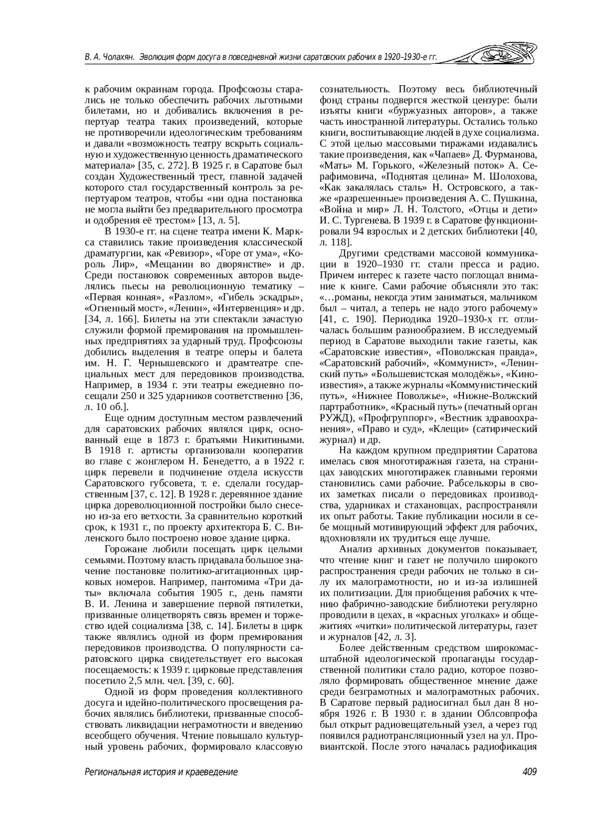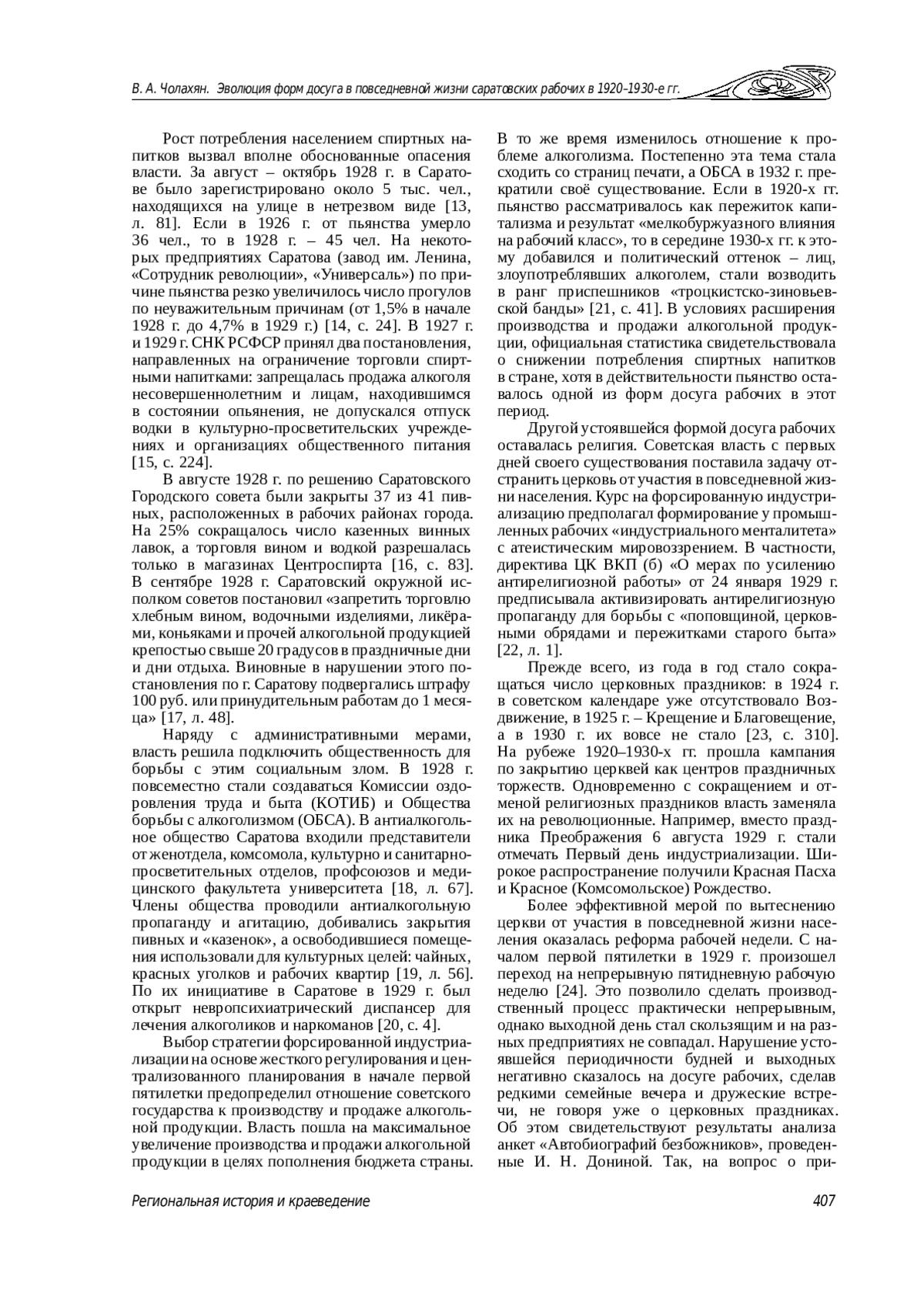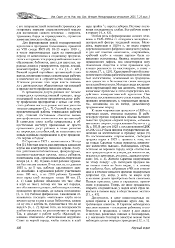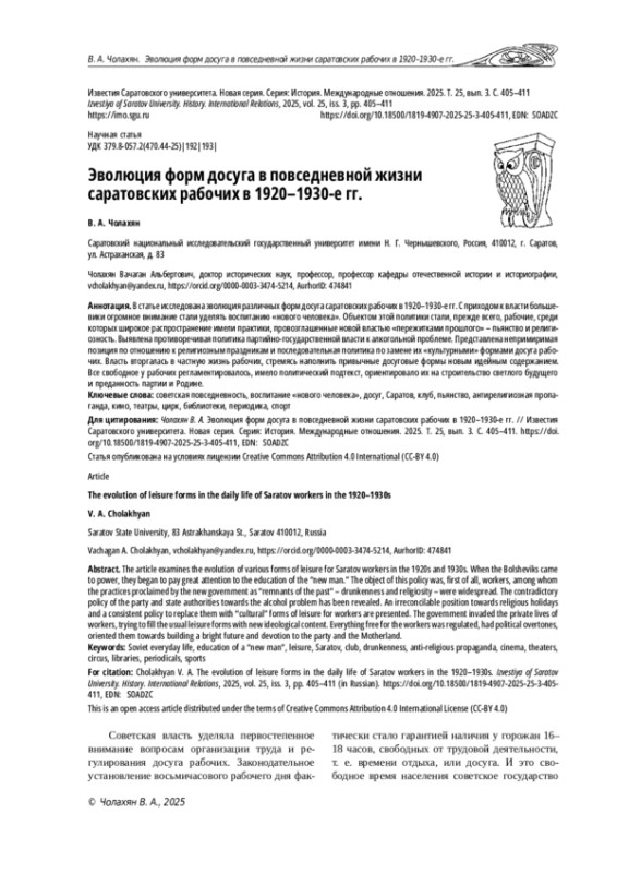 В статье исследована эволюция различных форм досуга саратовских рабочих в 1920–1930-е гг. С приходом к власти большевики огромное внимание стали уделять воспитанию «нового человека». Объектом этой политики стали, прежде всего, рабочие, среди которых широкое распространение имели практики, провозглашенные новой властью «пережитками прошлого» – пьянство и религиозность. Выявлена противоречивая политика партийно-государственной власти к алкогольной проблеме. Представлена непримиримая позиция по отношению к религиозным праздникам и последовательная политика по замене их «культурными» формами досуга рабочих. Власть вторгалась в частную жизнь рабочих, стремясь наполнить привычные досуговые формы новым идейным содержанием. Все свободное у рабочих регламентировалось, имело политический подтекст, ориентировало их на строительство светлого будущего и преданность партии и Родине.