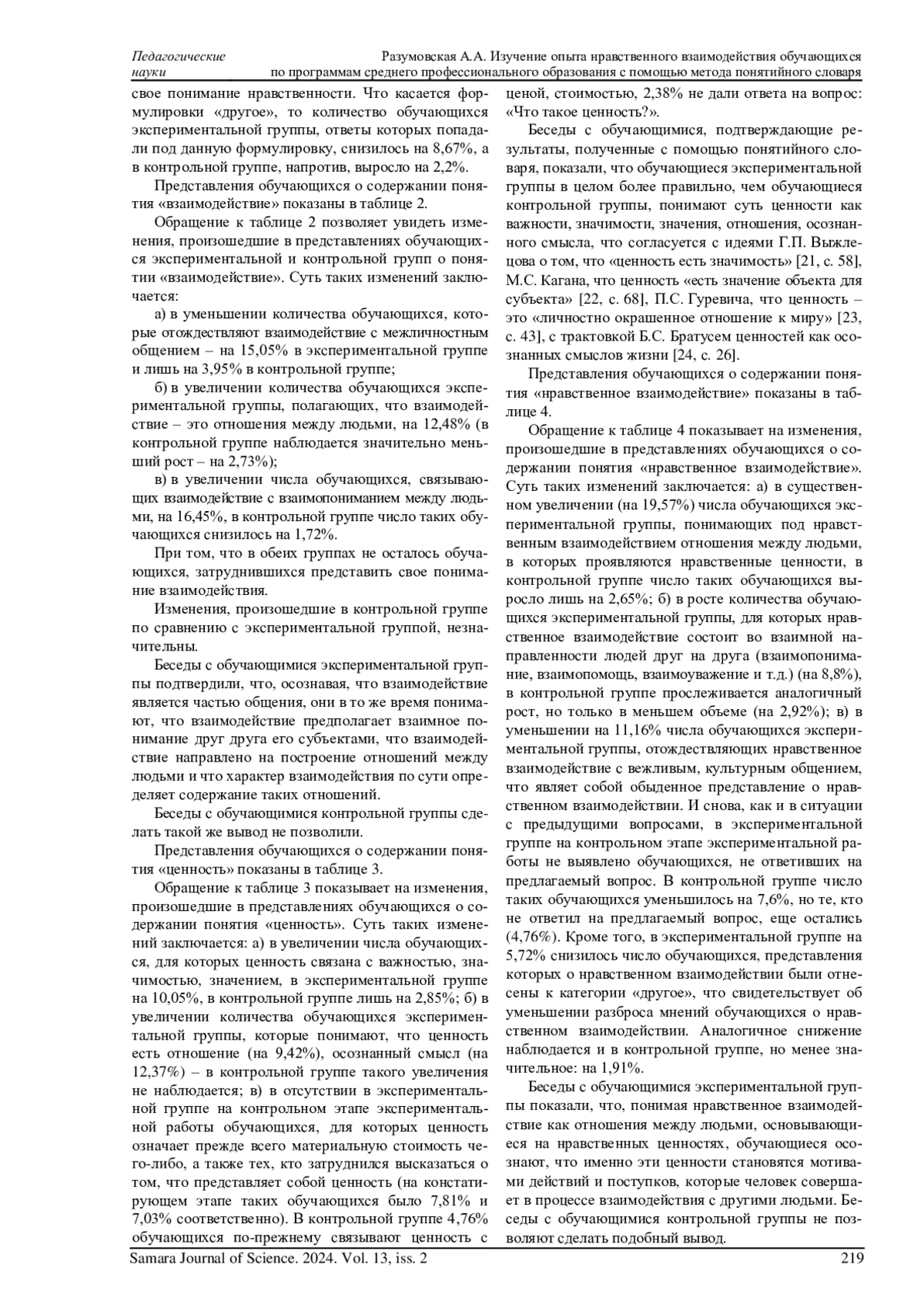 19. Разумовская А.А. Содержание структурных компонентов опыта нравственного взаимодействия студентов с другими людьми // Вестник Тверского государственного университета. Серия: Педагогика и психология. 2022. № 3 (60). С. 103-117. DOI: 10.26456/vtpsyped/2022.3.103 EDN: MVBEPW