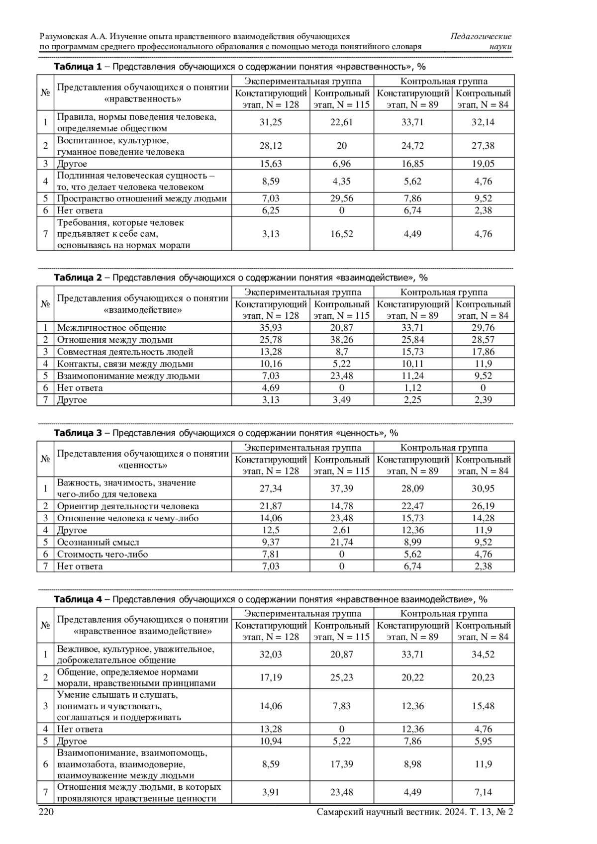 В статье актуализируется проблема нравственного воспитания современной российской молодежи, одним из аспектов которой является формирование у обучающихся опыта нравственного взаимодействия с другими людьми. Выявляются научные предпосылки для эффективного решения проблемы формирования опыта нравственного взаимодействия обучающихся с людьми в условиях учреждения среднего профессионального образования. Предлагается структура опыта нравственного взаимодействия, образуемая когнитивным, мотивационно-ценностным, коммуникативным и поведенческим компонентами. Определяются возможности метода понятийного словаря в изучении сформированности у обучающихся в учреждении среднего профессионального образования когнитивного компонента опыта нравственного взаимодействия, содержание которого (компонента) образуют знания о нравственности, о взаимодействии, о нравственном взаимодействии, о ценности. Обосновывается выбор экспериментальной и контрольной групп. Сравниваются результаты, полученные с помощью метода понятийного словаря как метода научно-педагогического исследования при изучении знаний о понятиях «нравственность», «взаимодействие», «нравственное взаимодействие», «ценность», имеющихся у обучающихся первого и выпускного курсов экспериментальной и контрольной групп, и представляются изменения, произошедшие в содержании знаний обучающихся. Обосновывается вывод об эффективности экспериментальной работы по формированию опыта нравственного взаимодействия обучающихся по программам среднего профессионального образования.