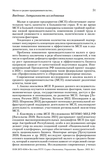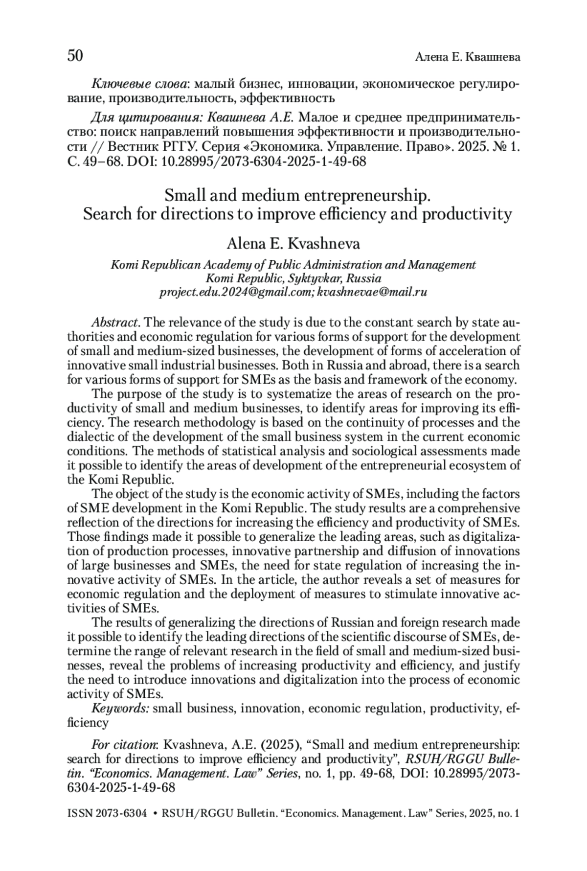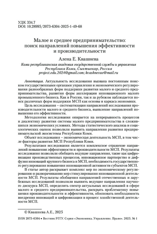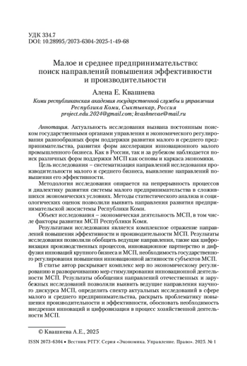 В статье автор раскрывает комплекс мер по экономическому регулированию и разворачиванию мер стимулирования инновационной деятельности МСП. Результаты обобщения направлений отечественных и зарубежных исследований позволили выявить ведущие направления научного дискурса МСП, определить спектр актуальных исследований в сфере малого и среднего предпринимательства, раскрыть проблематику повышения производительности и эффективности, обосновать необходимость внедрения инноваций и цифровизации в процесс хозяйственной деятельности МСП.