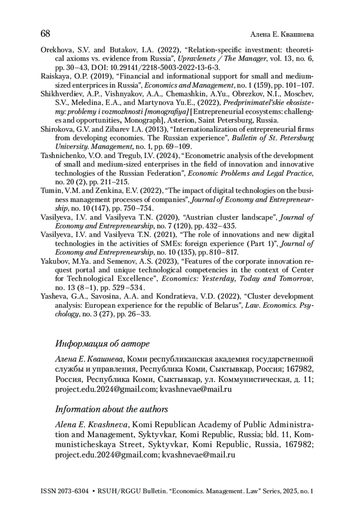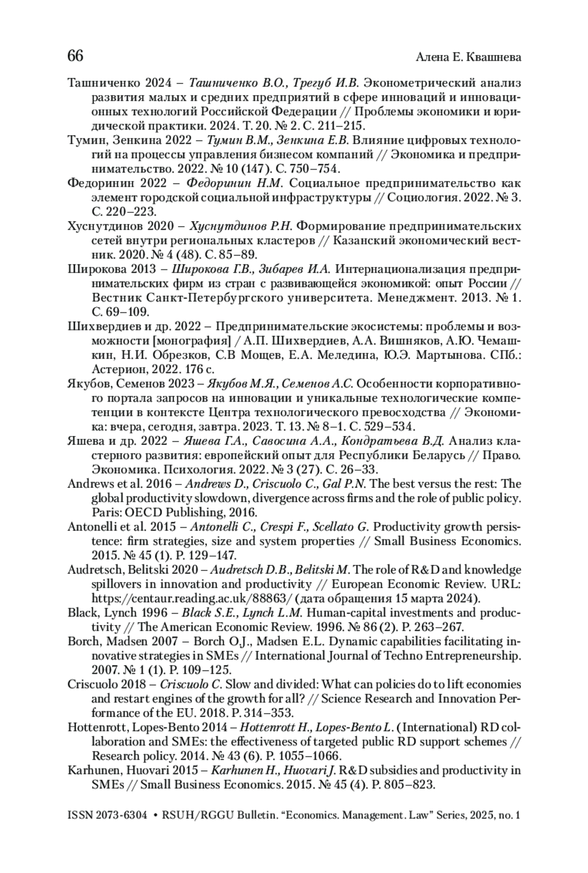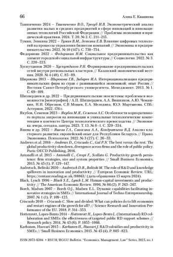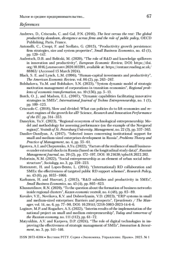 6. Егорова, Чепуренко 2022 - Егорова А.И., Чепуренко А.Ю. Факторы упругости малого предпринимательства в условиях внешних шоков в России (по данным лонгитюдного исследования) // Российский журнал менеджмента. 2022. Т. 20. № 2. С. 172-197. https://doi.org/10.21638/spbu18.2022.202.