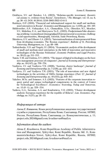 12. Ташниченко 2024 - Ташниченко В.О., Трегуб И.В. Эконометрический анализ развития малых и средних предприятий в сфере инноваций и инновационных технологий Российской Федерации // Проблемы экономики и юридической практики. 2024. Т. 20. № 2. С. 211-215.