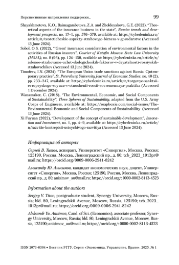 16. Соболь 2022 - Соболь О.С. «Зеленое» страхование: учет экологических факторов в деятельности российских страховщиков // Вестник Университета имени О.Е. Кутафина. 2022. № 8 (96). С. 124-130. URL: https://cyberleninka.ru/article/n/zelenoe-strahovanie-uchet-ekologicheskih-faktorov-v-deyatelnosti-rossiyskih-strahovschikov (дата обращения 13 июня 2024).