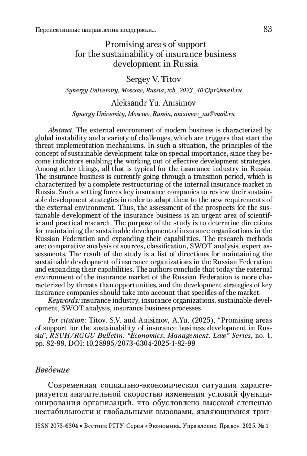 Внешняя среда современного бизнеса характеризуется глобальной нестабильностью и разнообразными вызовами, которые являются триггерами, запускающими механизмы реализации угроз. В такой ситуации принципы концепции устойчивого развития приобретают особое значение, поскольку становятся индикаторами, позволяющими разрабатывать эффективные стратегии развития. Все это в том числе характерно для страховой отрасли России. Страховой бизнес на данный момент переживает переходный период, который характеризуется полной перестройкой внутреннего страхового рынка России. Такая ситуация вынуждает ключевые страховые организации пересматривать свои стратегии устойчивого развития для их адаптации к новым требованиям внешней среды. Таким образом, оценка перспектив устойчивого развития страхового бизнеса является актуальным направлением научно-практических исследований. Целью исследования является разработка направлений поддержания устойчивого развития страховых организаций Российской Федерации и расширения их возможностей. Методами исследования выступают: компаративный анализ источников, классификация, SWOT-анализ, экспертные оценки. Результатом исследования является перечень направлений поддержания устойчивого развития страховых организаций Российской Федерации и расширения их возможностей. Авторы делают вывод, что на сегодняшний день внешняя среда страхового бизнеса Российской Федерации в большей степени характеризуется угрозами, нежели возможностями, и стратегии развития ключевых страховых компаний должны учитывать эту специфику рынка.