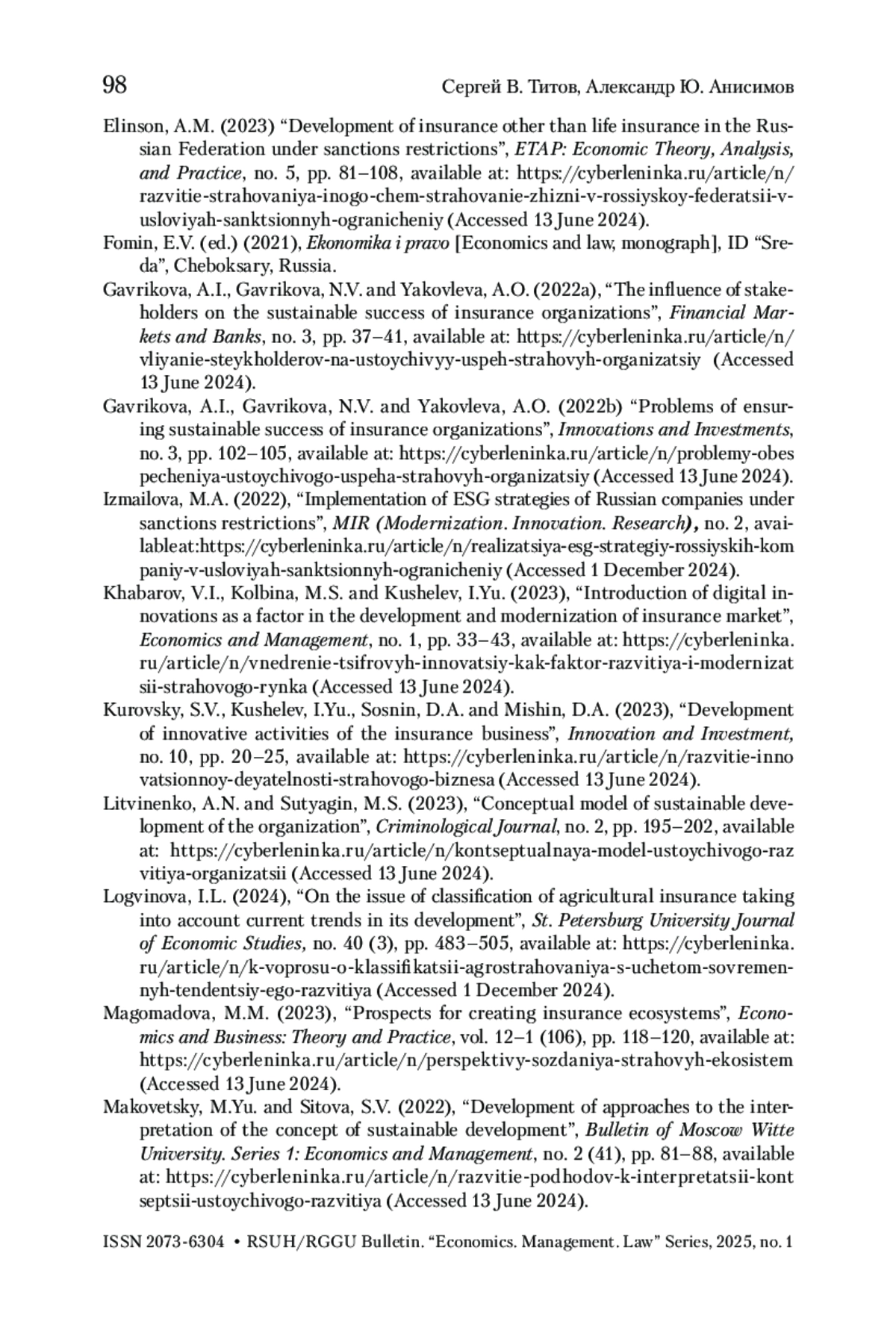 5. Гаврикова и др. 2022a - Гаврикова А.И., Гаврикова Н.В., Яковлева А.О. Влияние стейкхолдеров на устойчивый успех страховых организаций // Финансовые рынки и банки. 2022. № 3. С. 37-41. URL: https://cyberleninka.ru/article/n/vliyanie-steykholderov-na-ustoychivyy-uspeh-strahovyh-organizatsiy (дата обращения 13 июня 2024).
