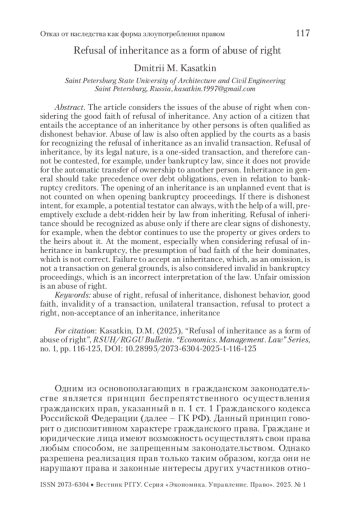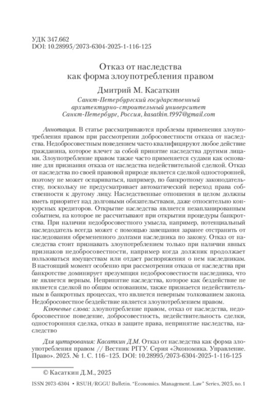 В статье рассматриваются проблемы применения злоупотребления правом при рассмотрении добросовестности отказа от наследства. Недобросовестным поведением часто квалифицируют любое действие гражданина, которое влечет за собой принятие наследства другими лицами. Злоупотребление правом также часто применяется судами как основание для признания отказа от наследства недействительной сделкой. Отказ от наследства по своей правовой природе является сделкой односторонней, поэтому не может оспариваться, например, по банкротному законодательству, поскольку не предусматривает автоматический переход права собственности к другому лицу. Наследственные отношения в целом должны иметь приоритет над долговыми обязательствами, даже относительно конкурсных кредиторов. Открытие наследства является незапланированным событием, на которое не рассчитывают при открытии процедуры банкротства. При наличии недобросовестного умысла, например, потенциальный наследодатель всегда может с помощью завещания заранее отстранить от наследования обремененного долгами наследника по закону. Отказ от наследства стоит признавать злоупотреблением только при наличии явных признаков недобросовестности, например когда должник продолжает пользоваться имуществам или отдает распоряжения о нем наследникам. В настоящий момент особенно при рассмотрении отказа от наследства при банкротстве доминирует презумпция недобросовестности наследника, что не является верным. Непринятие наследства, которое как бездействие не является сделкой по общим основаниям, также признается недействительным в банкротных процессах, что является неверным толкованием закона.