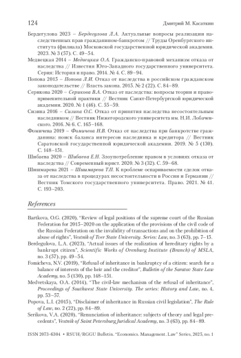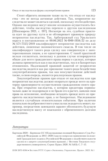 7. Фомичева 2019 - Фомичева Н.В. Отказ от наследства при банкротстве гражданина: поиск баланса интересов наследника и кредитора // Вестник Саратовской государственной юридической академии. 2019. № 5 (130). С. 148-151.