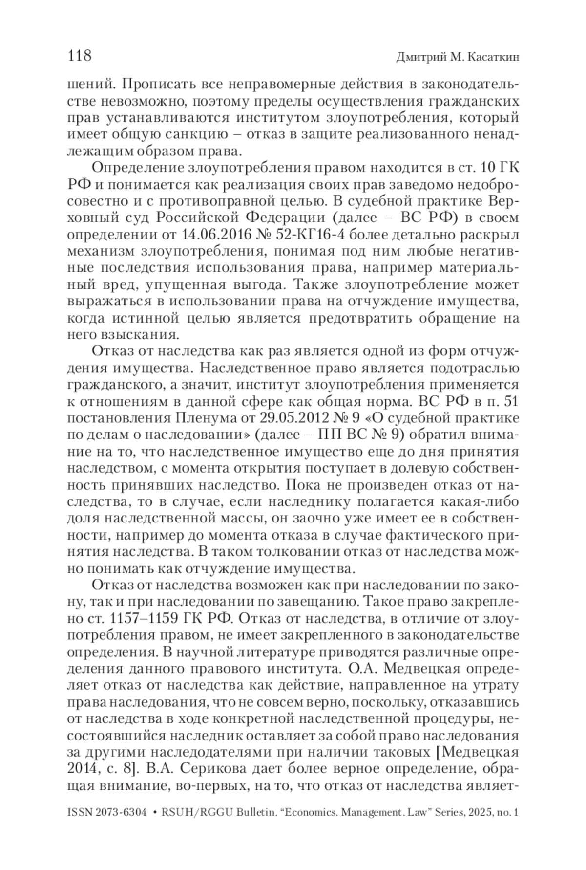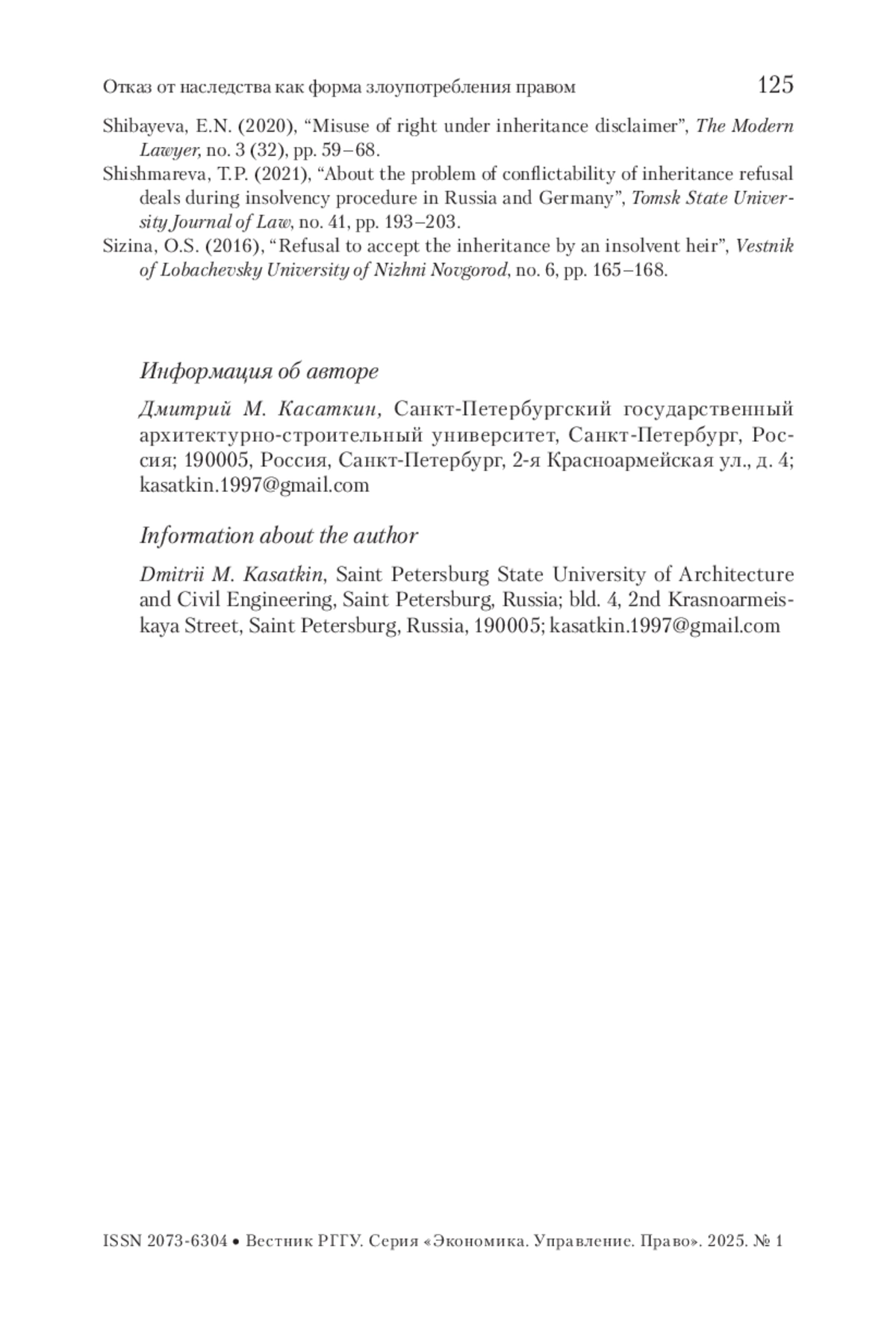 8. Шибаева 2020 - Шибаева Е.Н. Злоупотребление правом в условиях отказа от наследства // Современный юрист. 2020. № 3 (32). С. 59-68.