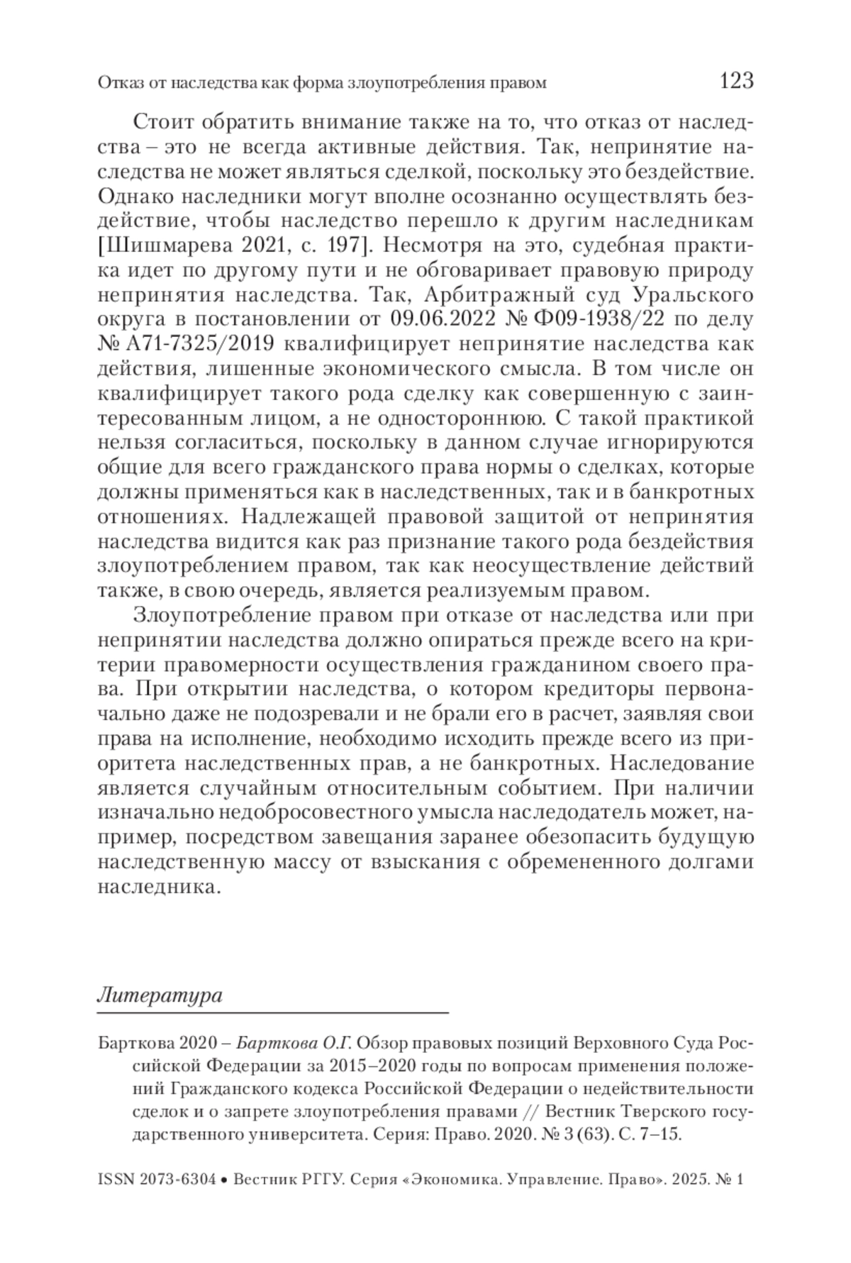 1. Барткова 2020 - Барткова О.Г. Обзор правовых позиций Верховного Суда Российской Федерации за 2015-2020 годы по вопросам применения положений Гражданского кодекса Российской Федерации о недействительности сделок и о запрете злоупотребления правами // Вестник Тверского государственного университета. Серия: Право. 2020. № 3 (63). С. 7-15.