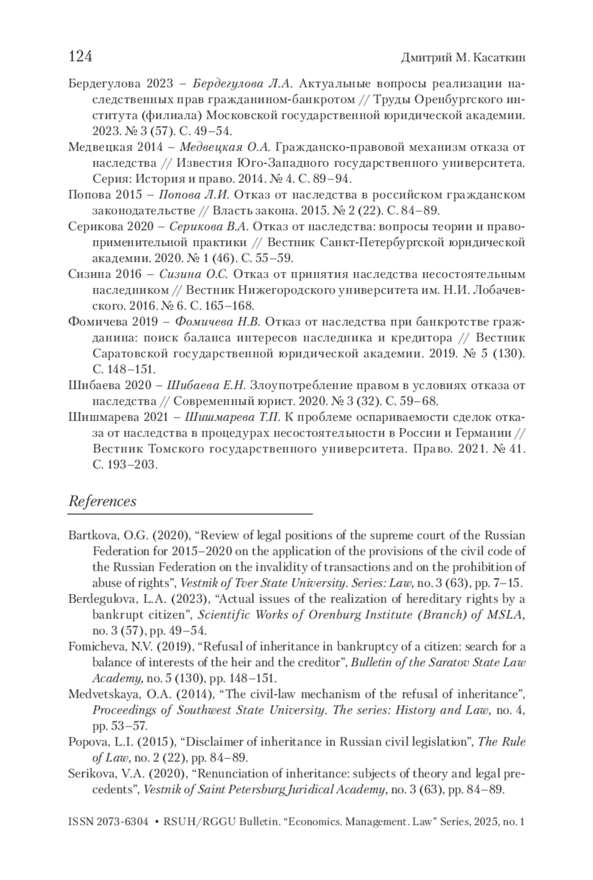 2. Бердегулова 2023 - Бердегулова Л.А. Актуальные вопросы реализации наследственных прав гражданином-банкротом // Труды Оренбургского института (филиала) Московской государственной юридической академии. 2023. № 3 (57). С. 49-54.