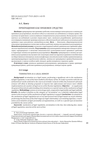 Введение: прекращение как правовое средство, выполняющее значимую роль в механизме правового регулирования, является одним из наименее исследованных в теории права. Его изучение на практике с использованием теоретических результатов, достигнутых в ходе научных исследований в рамках отраслевых наук, позволит разработать предложения по усовершенствованию правоприменения и обеспечению более надежного исполнения ряда правовых норм российского законодательства. Цель - дополнить общетеоретическое понимание прекращения в качестве особого средства механизма правового регулирования.